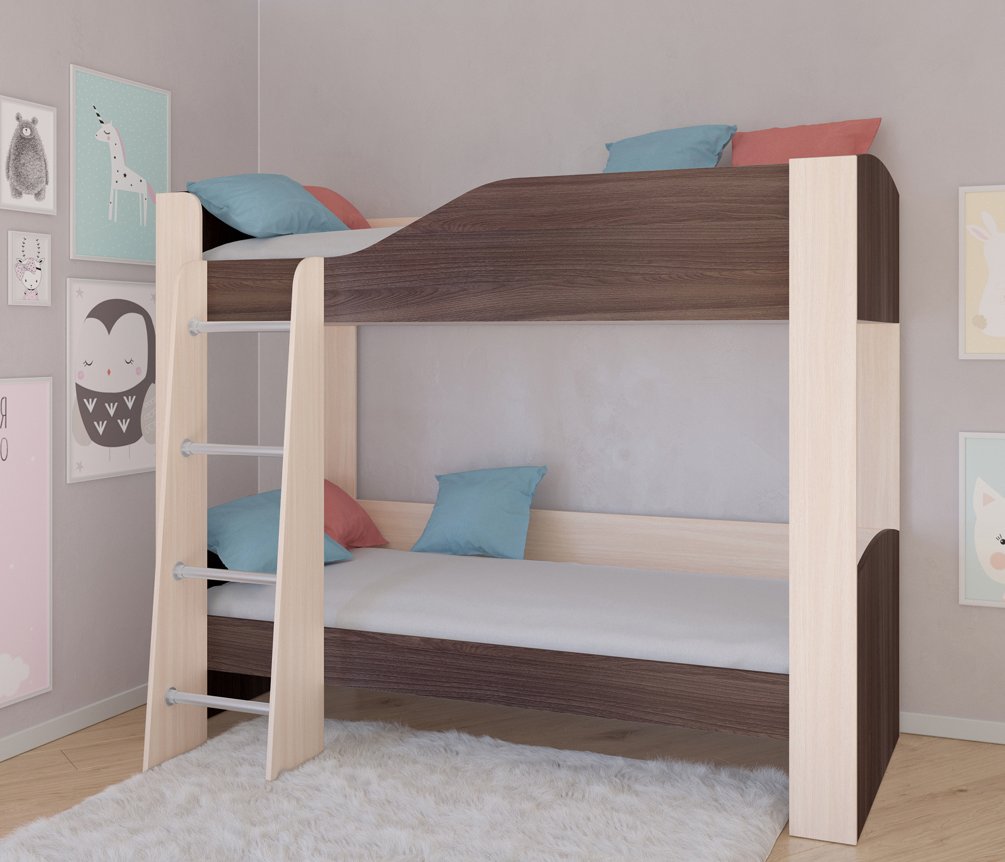 Кровать двухъярусная Астра 2 проста по своей конструкции, за счет чего может похвастаться высокой надежностью при низкой цене. Вместе с тем она обладает 2 полноценными спальными местами, удобной лестницей и привлекательным внешним видом.