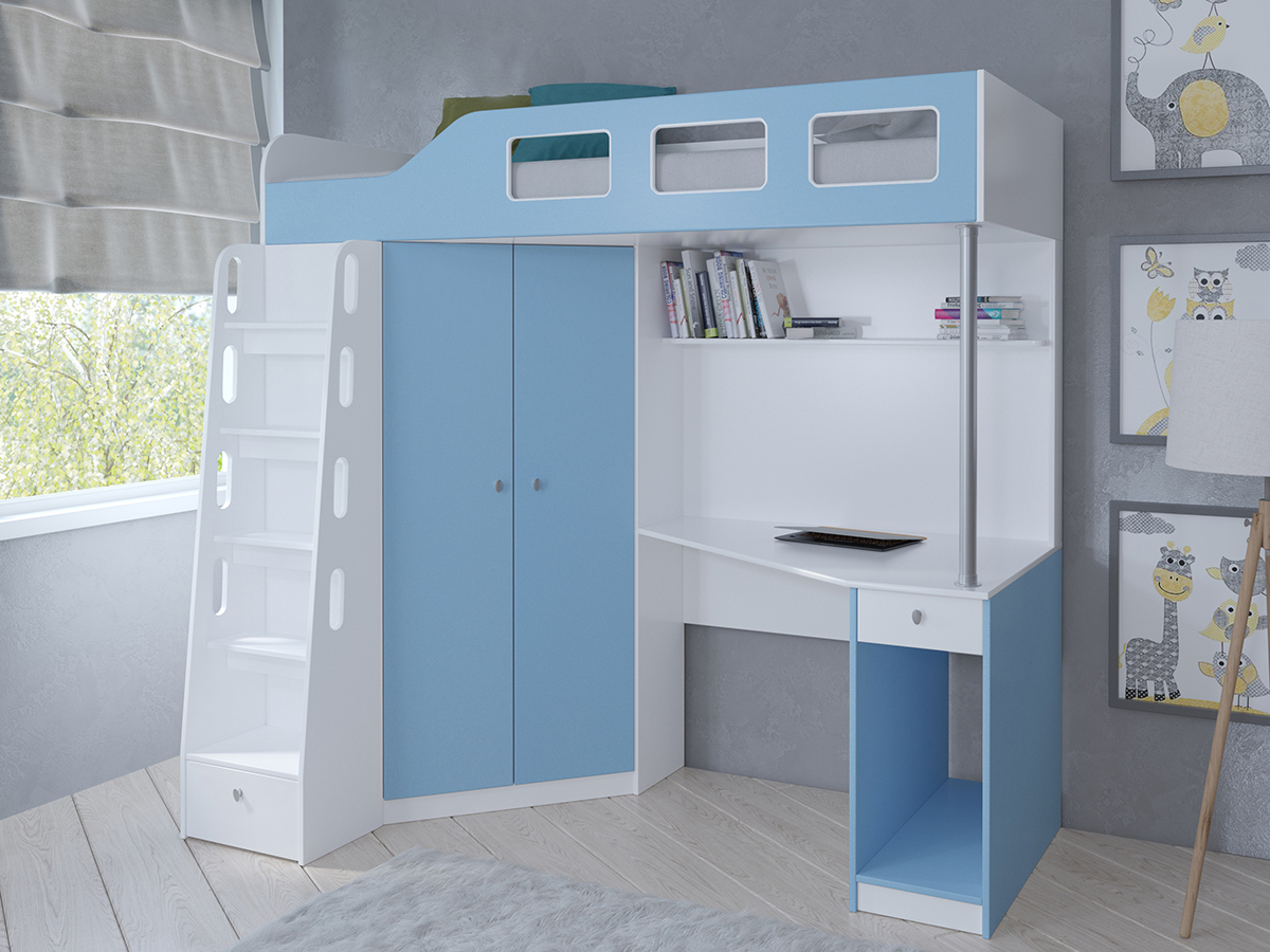 Кровать-чердак Астра 7 сочетает в себе полноценное спально место с удобной рабочей зоной. Удобство доступа на верхний ярус обеспечиват удобная лестница с металлическими ступенями. В основании лестницы расположен ящик для детских принадлежностей. Рабочая зона располагает удобным столом, полкой для книг и местом для системного блока компьютера. Так же слева от стола расположен удобный, вместительный шкаф для одежды.