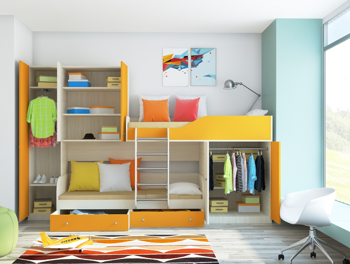 Двухъярусная кровать Лео представляет из себя полноценный комплект для детской комнаты. Два полноценных спальных места помогут хорошо выспаться и набраться сил. Удобный доступ к верхнему ярусу обеспечивается за счет надежной лестницы с металлическими ступенями. Развитая система хранения вещей данной кровати позволит разместить в своих недрах все необходимые вещи. Постельное белье с легкостью поместиться в ящики, расположенные под нижним ярусом. Так же кровать располагает платяным шкафом, высокой колонкой с полками и вместительной антресолью.