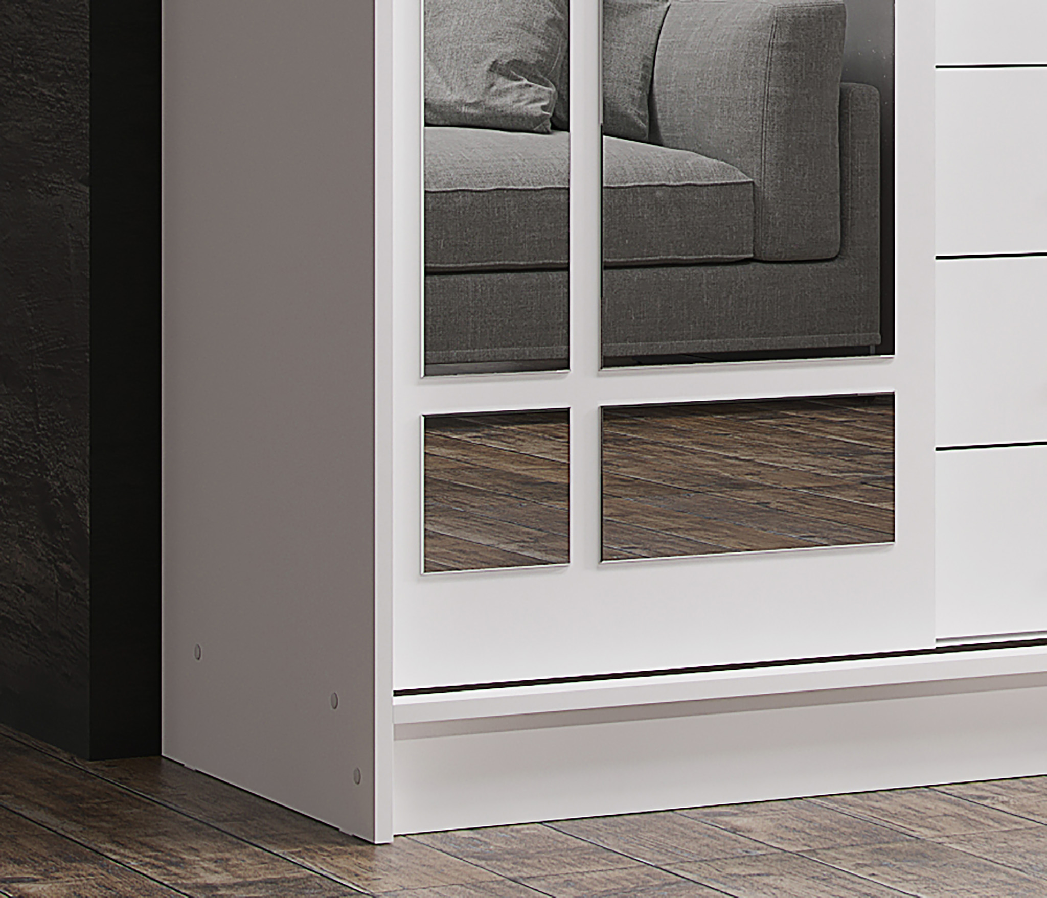 Содержит отдел с антресольной полкой и штангой для вешалок, отдел с полками, два выдвижных ящика и отдел с двумя штангами для вешалок. Зеркала входят в комплект. Материал ЛДСП, кромка ПВХ, зеркало