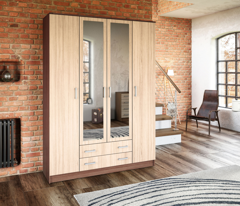 Большой распашной шкаф КВАДРО подарит вашему дому удобную систему хранения и визуально расширит пространство помещения, благодаря зеркалам на двух центральных дверцах. Функциональная и продуманная система хранения представлена двумя вертикальными секциями полок, парой широких выдвижных ящиков и отделением со штангой для вешалок.