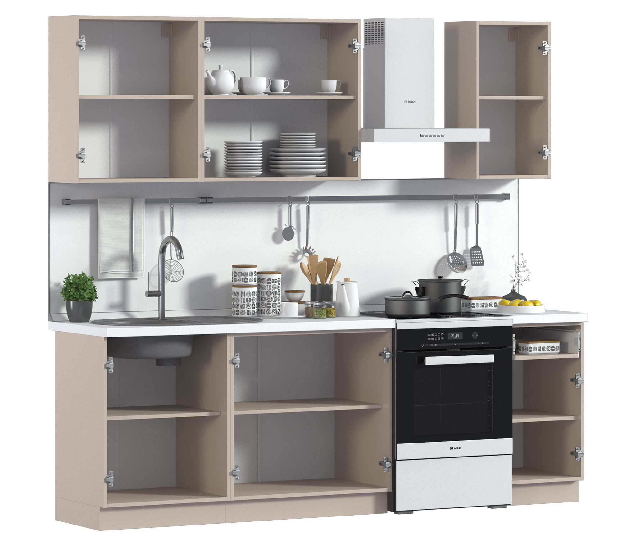 Рекомендуем дополнить кухню столешницей, стеновой панелью, аксессуарами, бытовой техникой, мойкой и сушкой для посуды.