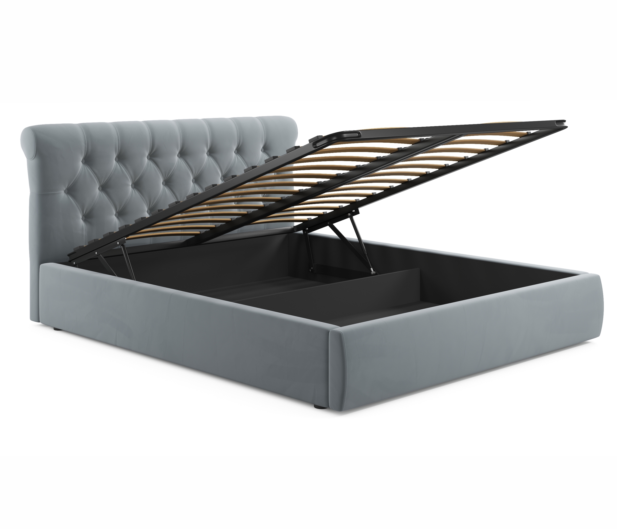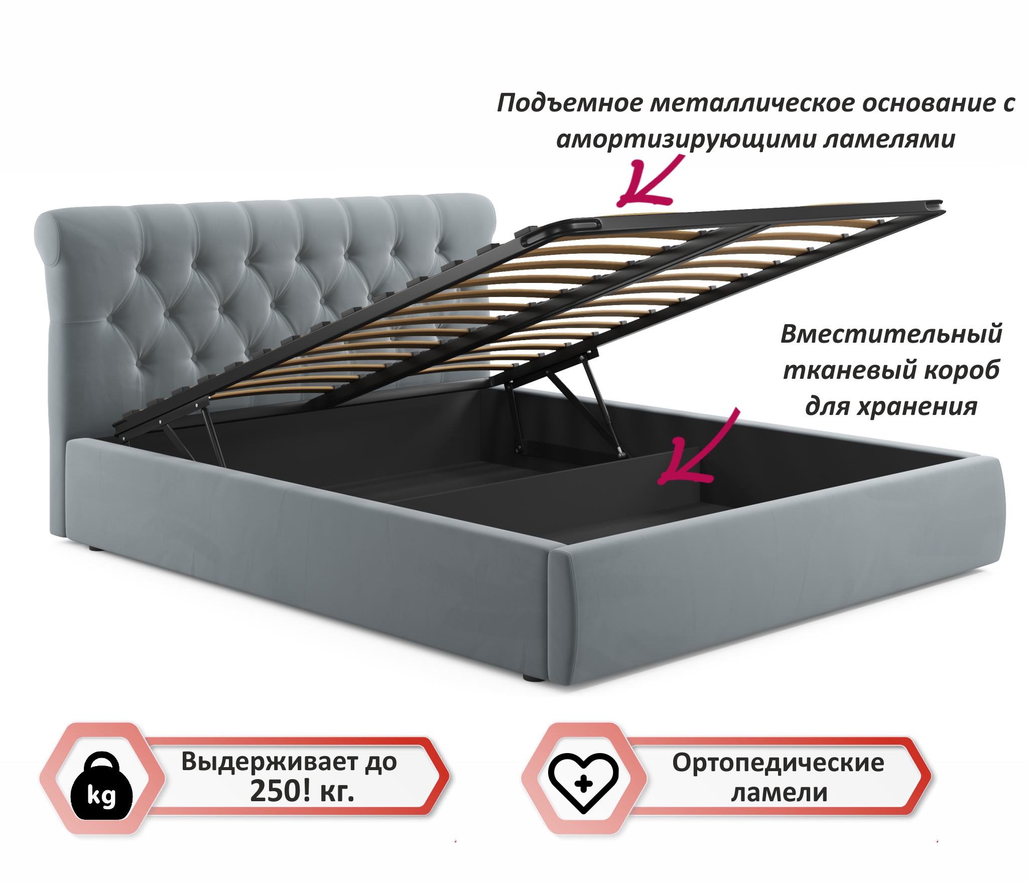 • Кровать оборудована удобным подъемным механизмом.
