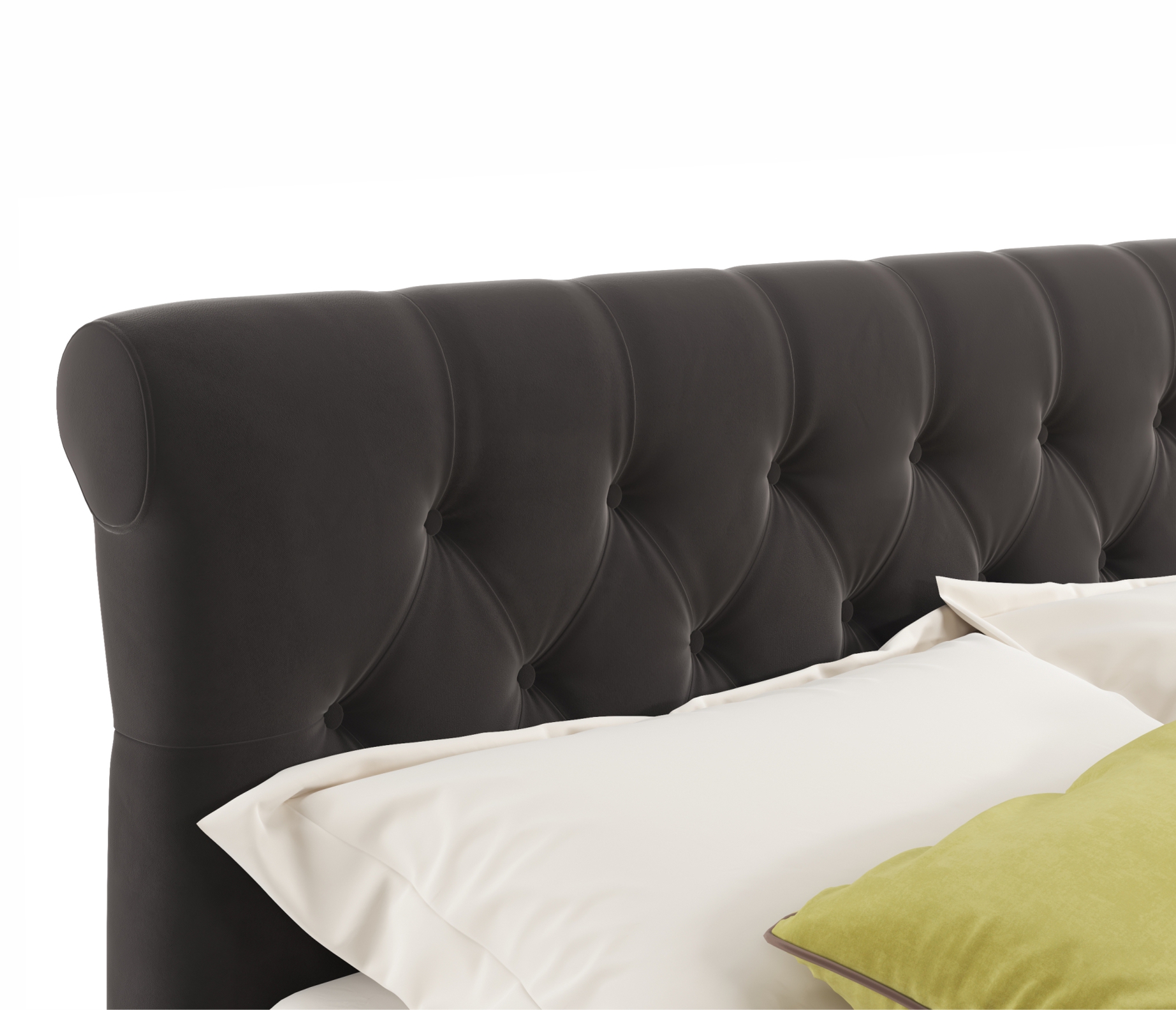 Яркий акцент 2-спальной подъемной кровати Ameli сделан на мягкое высокую рельефную спинку (мягкий подголовник) в стиле «Chester Laurence» с классической «каретной стяжкой», изготовленную вручную мастерами с 20-летним стажем.