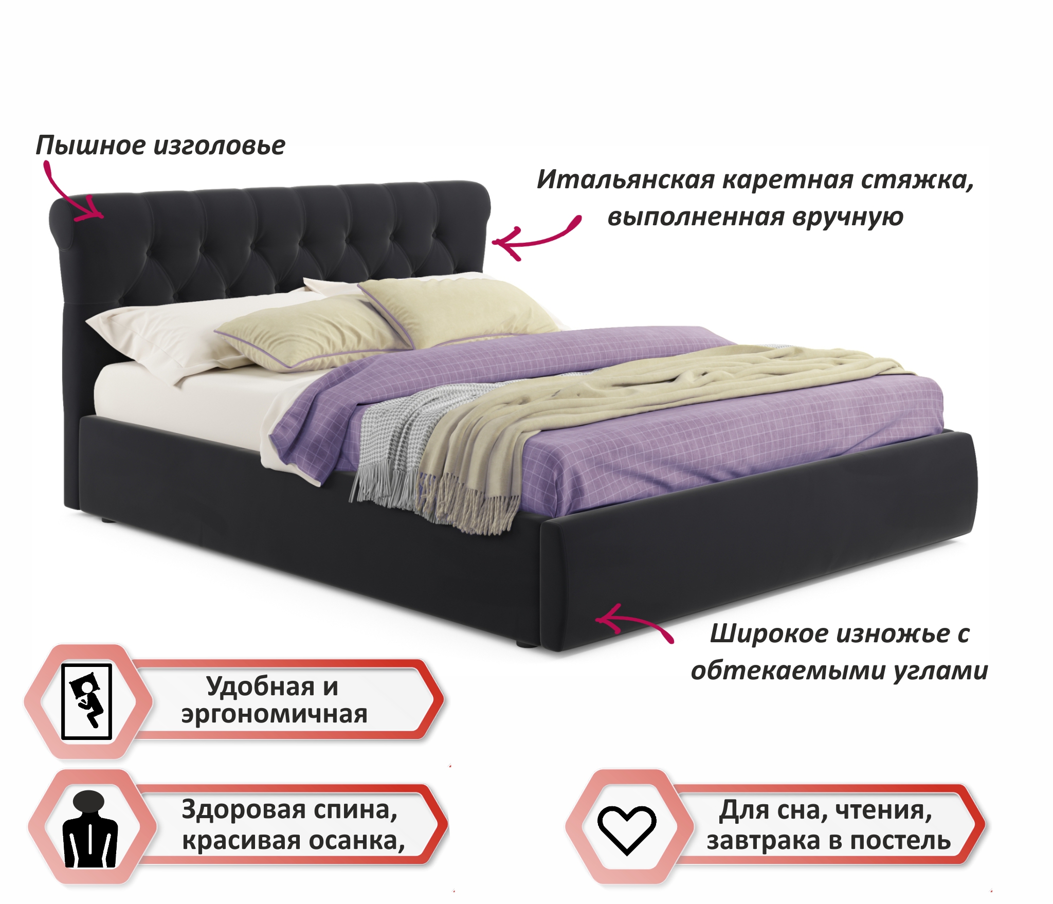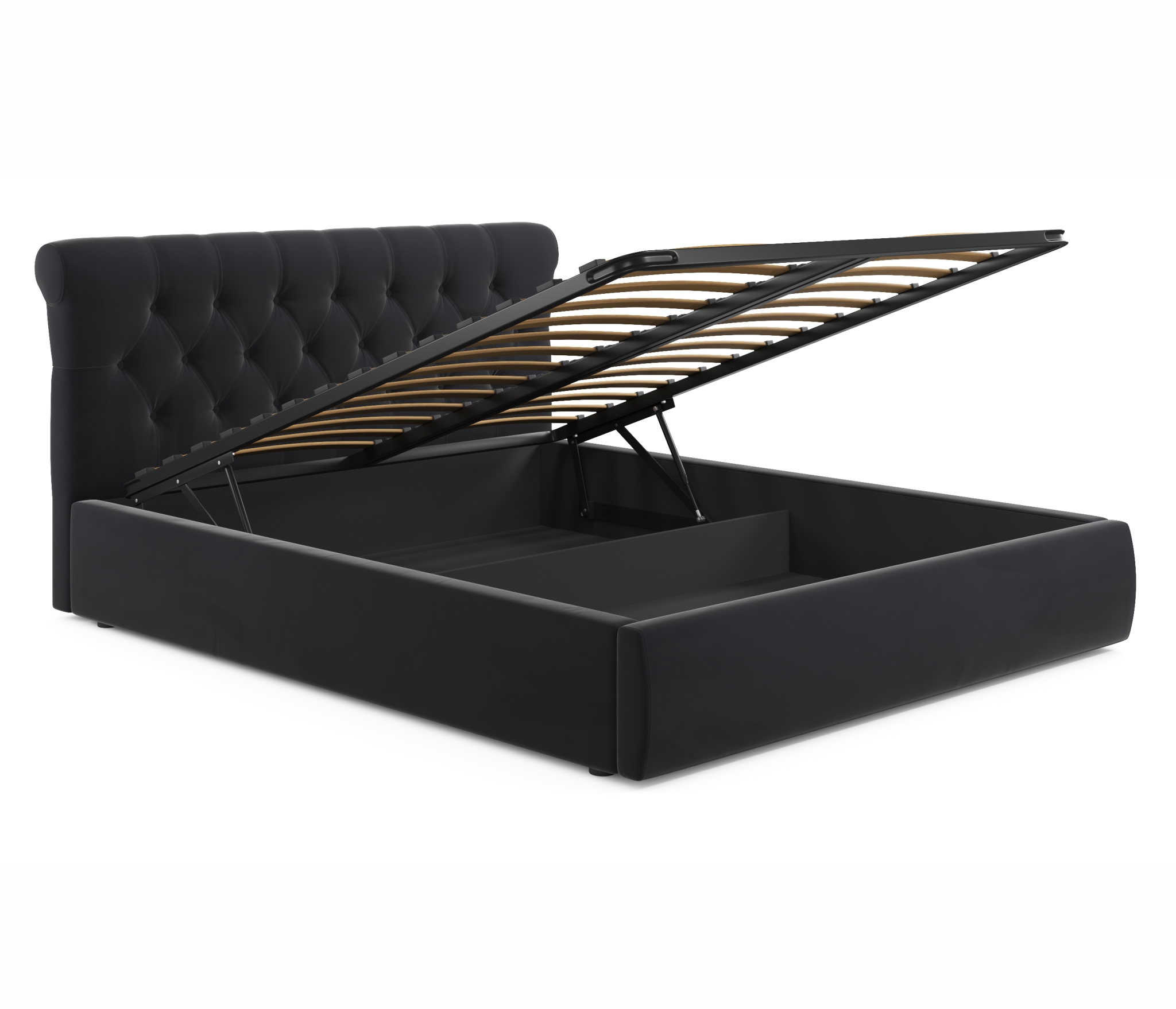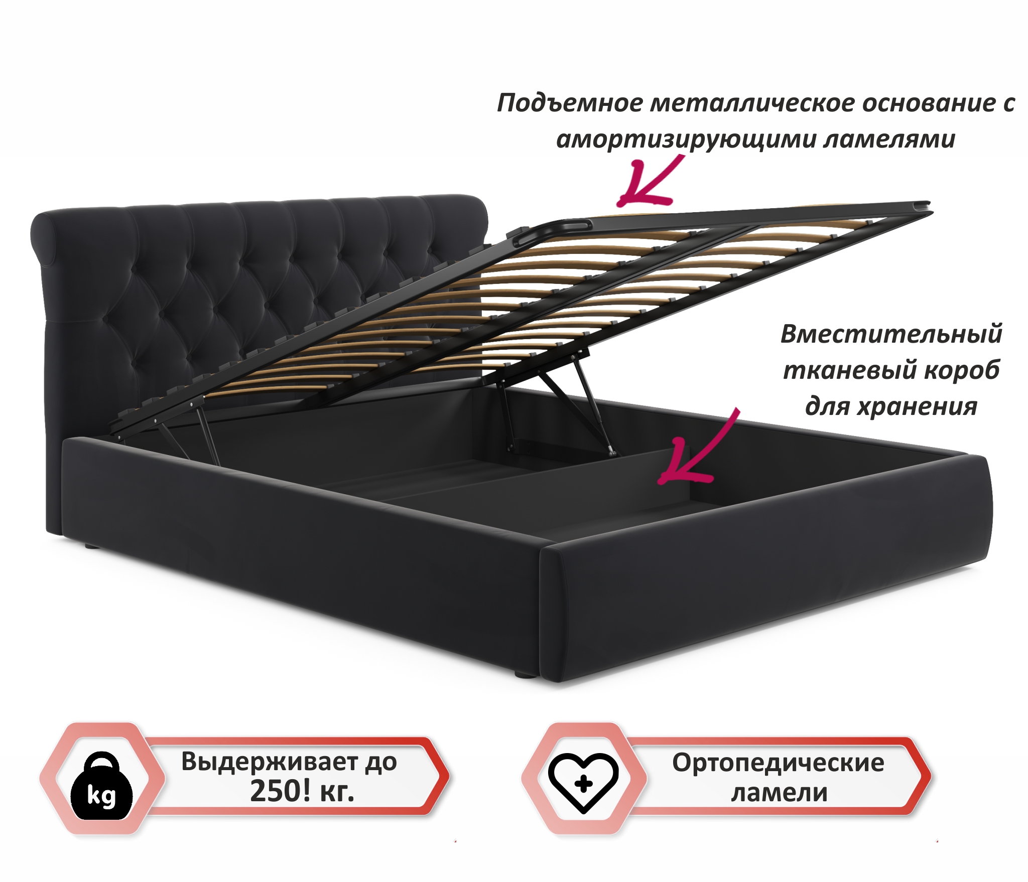 • Кровать оборудована удобным подъемным механизмом.