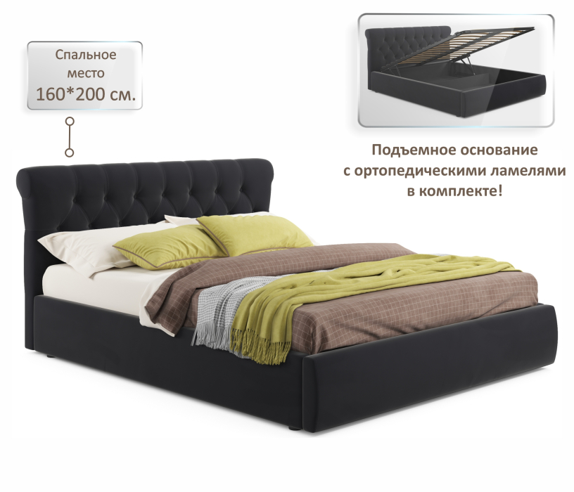 Мягкая кровать Ameli 1600 с подъемным механизмом (Велюр черный) Код I0000296175