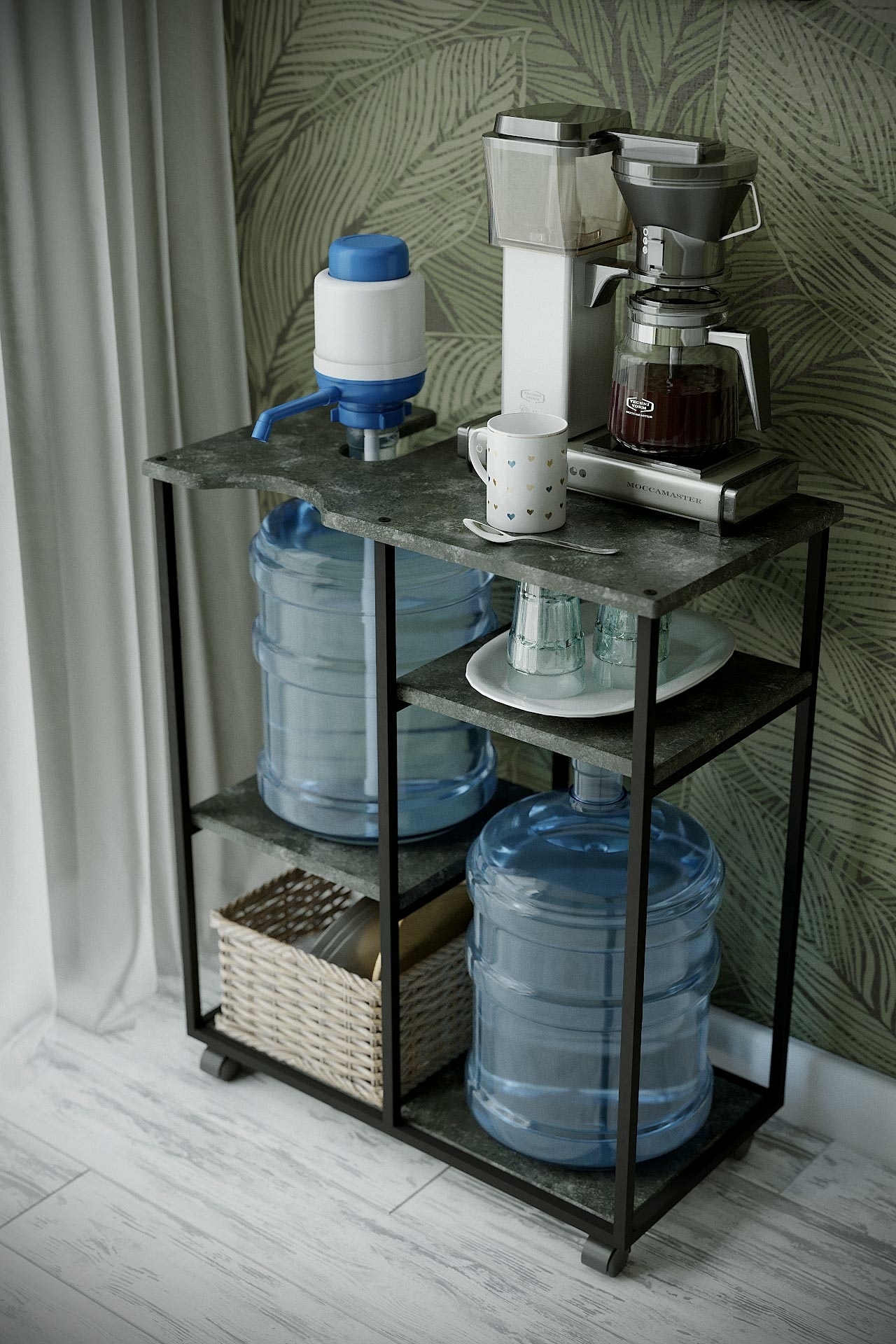 Современное направление Лофт - это простое и одновременно стильное оформление, где практичность сочетается с оригинальным исполнением. Подставка для воды «УОТЕР LOFT», выполненная в данном стиле, безусловно подчеркнет стилистику помещения. Сборно-разборный каркас подставки изготовлен из профильной трубы 15*15 мм, полки выполнены их экологичного материала МДФ. Данную подставку можно использовать и для кулера, и для бутыли, и сочетать бутыль с кулером и дополнительной бутылью, т.е. многофункциональность данной подставки позволяет использовать её как дома, в офисе или любом помещении для удобного и грамотного размещения воды. Основание подставки на роликовых опорах. Цветовая гамма подставки дополняет основную стилистику: влагостойкое декоративное покрытие, стилизованное под камень и дерево, безусловно придаст оригинальности и эстетики интерьеру.
