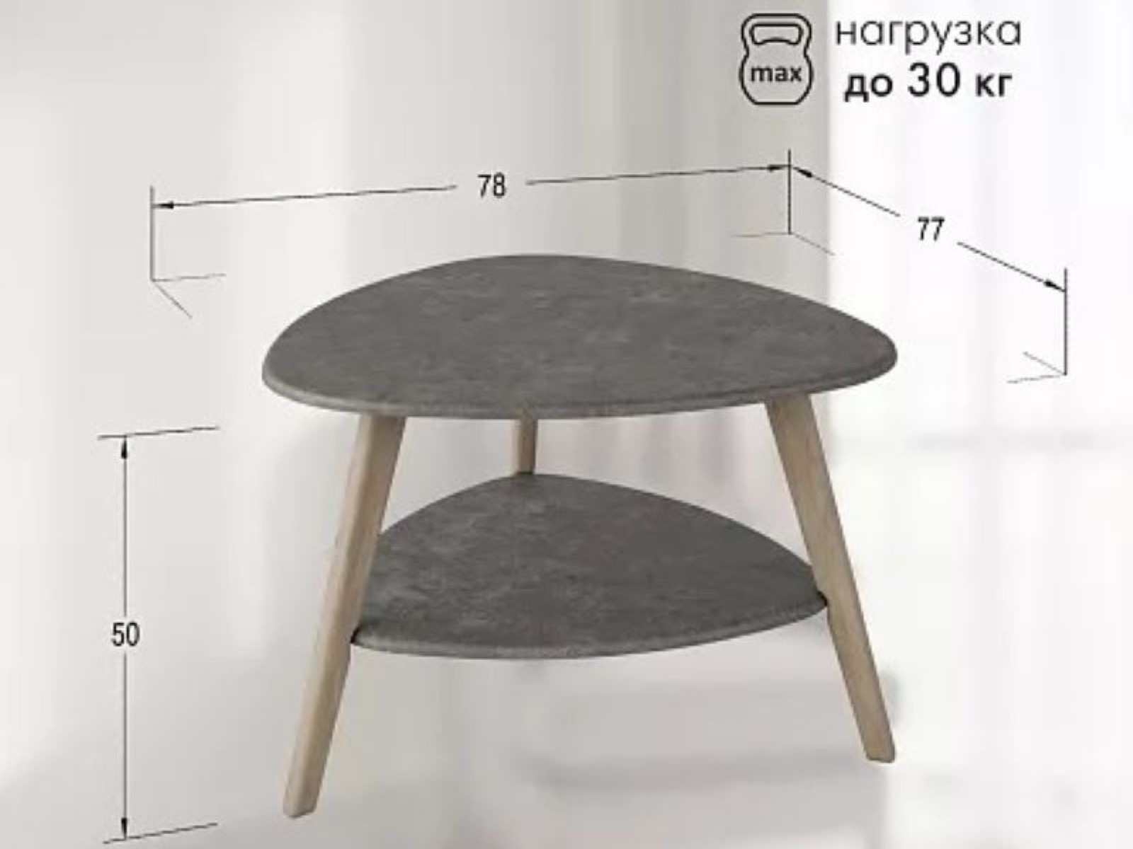 Столик имеет компактные размеры: длина 770 мм, ширина 780 мм, высота 500 мм.