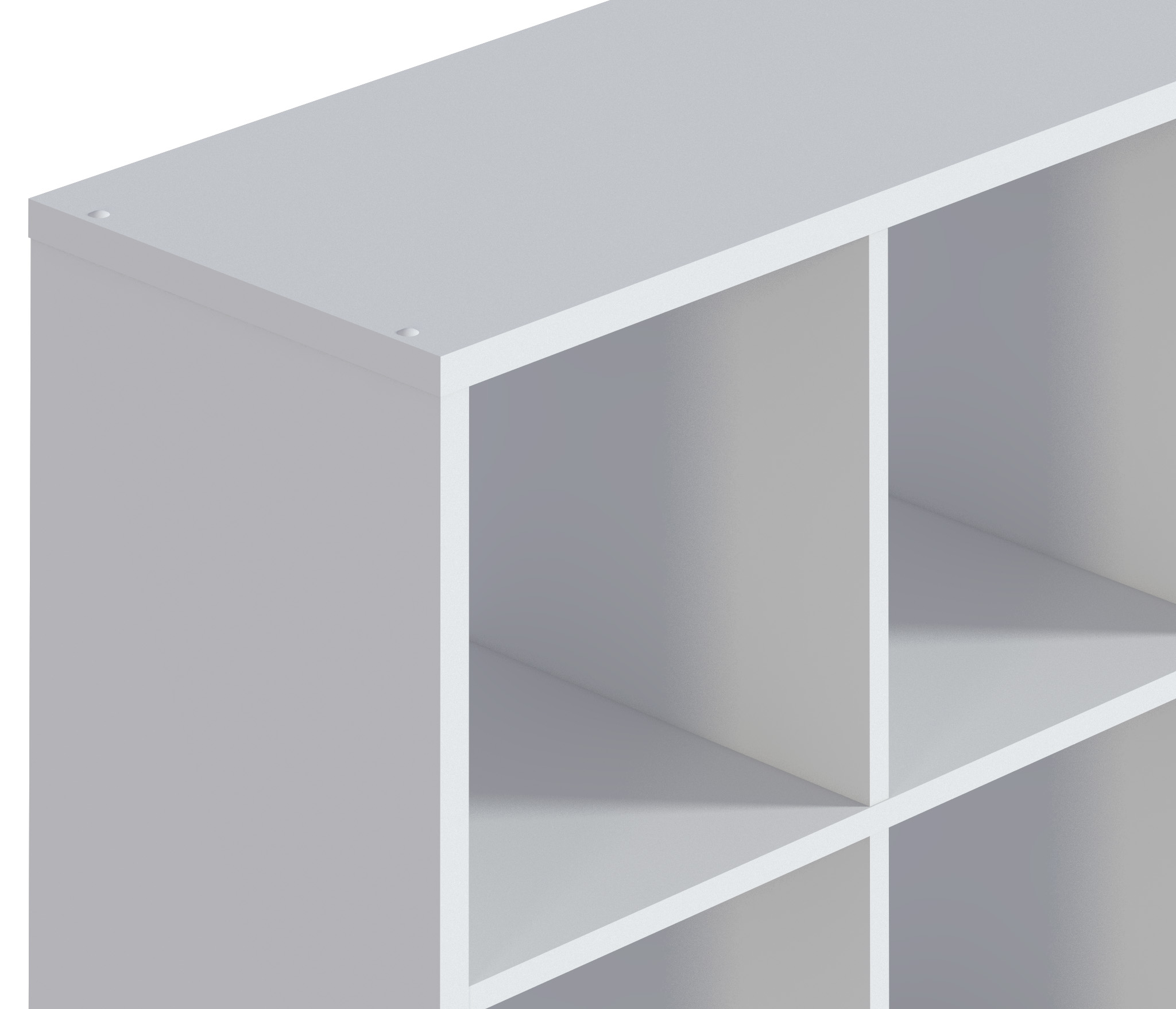 Габаритные размеры – ширина 105 см, высота 106 см и глубина 34 см. Конструктивно стеллаж состоит из девяти квадратных секций. Стеллаж можно применять для зонирования пространства, устанавливать у стены или в центре комнаты. Выполнен стеллаж из современного и прочного КДСП в белом цвете.