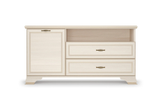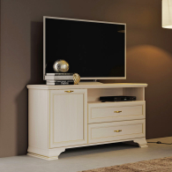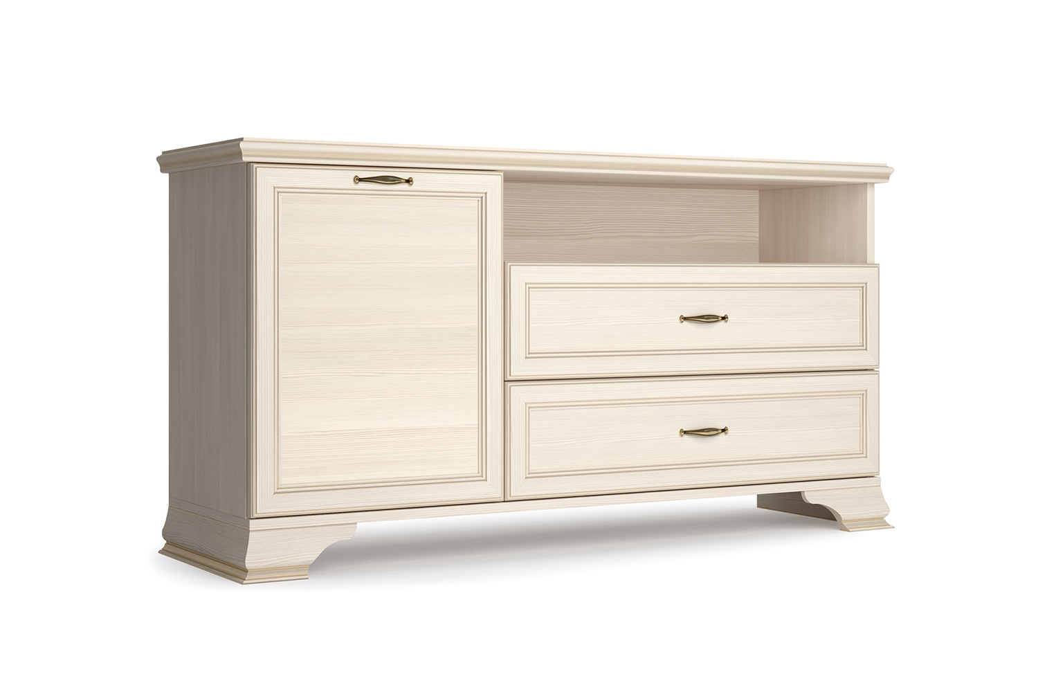 Недорогая и функциональная ТВ-тумба Сиена придется по вкусу любителям традиционной классики в интерьере. Помимо основной функции — установка телевизора, модуль поможет хранить вещи в открытом и закрытом виде, а также украсит пространство своим дизайном.Для закрытого хранения предусмотрены два 2 ящика и отделение с дверкой. Ниша под крышкой визуально облегчает конструкцию изделия и помогает разместить различную телевизионную аппаратуру.В основе модуля надежный корпус из ЛДСП 16 мм светлого оттенка "бодега белый". Эстетическое оформление обеспечивают декоративные накладки, профиль на крышке эффектные опоры МДФ.Мягкое сияние золотой патины и металлические ручки цвета старпя бронза обеспечивают модели респектабельный вид.