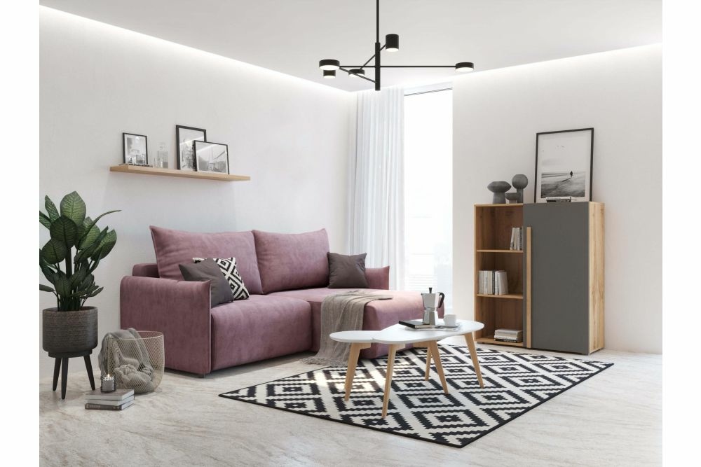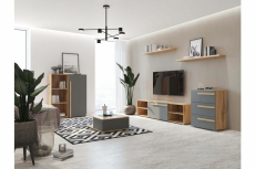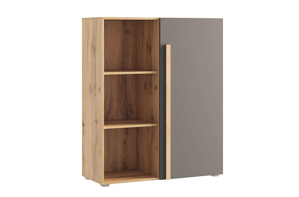 Стеллаж Виллитус М3 — корпус и фасады выполнены в стильных современных цветах "Графит" и "Дуб Вотан". Главной особенностью являются фрезерованные ручки из массива дуба. В стеллаже можно размещать элементы декора и книги на удобных открытых полках. Фурнитура - петли с доводчиками, на лицевых торцах долговечная кромка 2мм.