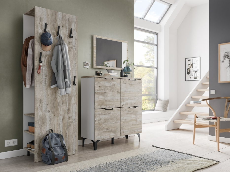 Организовать хранение в малогабаритной прихожей не всегда просто ввиду отсутствия места и особенностей планировки этого помещения в современных квартирах. С мебелью из коллекции Чикаго Вы быстро и с комфортом решите эту задачу! Использовать пространство рационально помогут: напольная вешалка интересной конструкции со штангой и крючками для верхней одежды и полками для обуви, вместительный комод с откидными дверцами и зеркало, как элемент декорирования пространства. Модульная коллекция выполнена из ЛДСП в современном декоре с тиснением натурального дерева и украшена стильной фурнитурой.