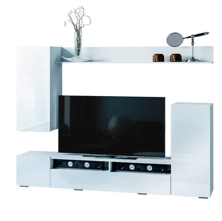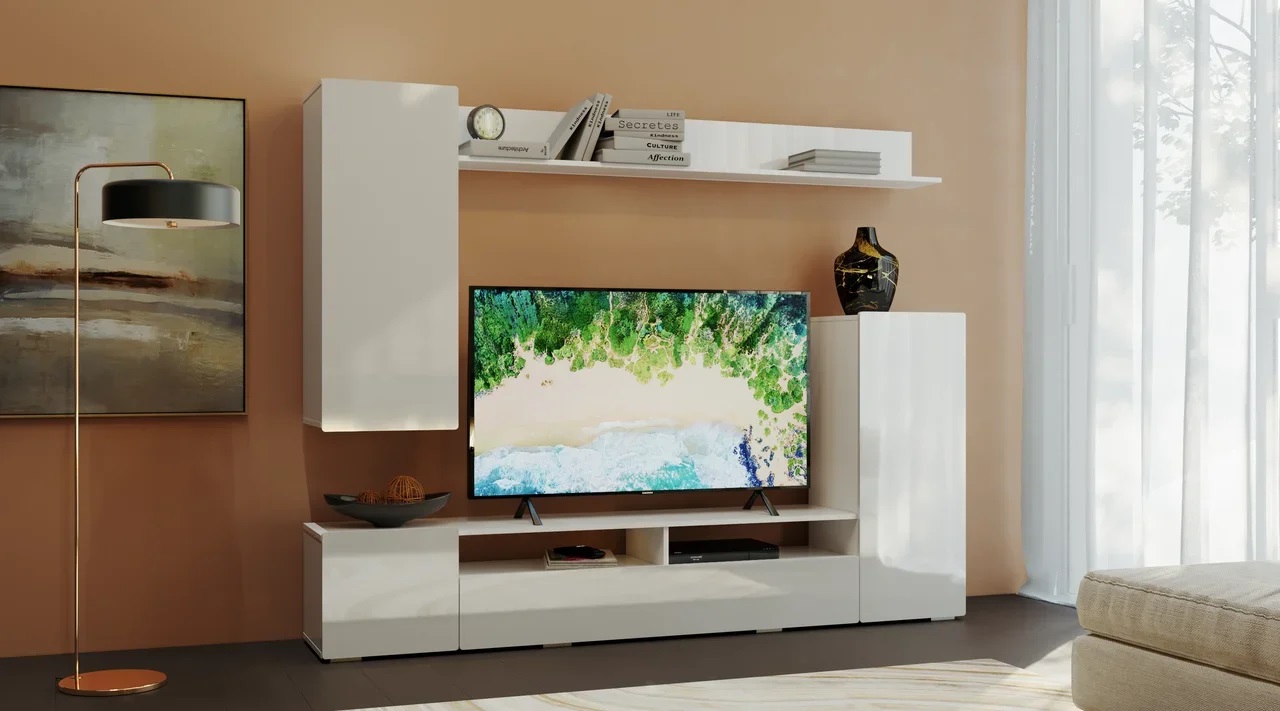 Гостиная Диаманд – отличное решение для современной гостиной. Сдержанный дизайн: белый глянец, скругленные фасады МДФ, отсутствие лицевой фурнитуры, - сделают Ваш интерьер стильным и лаконичным. Декоративная панель с открытыми полками позволит Вам расположить телевизор и другую технику, а также расставить предметы декора.