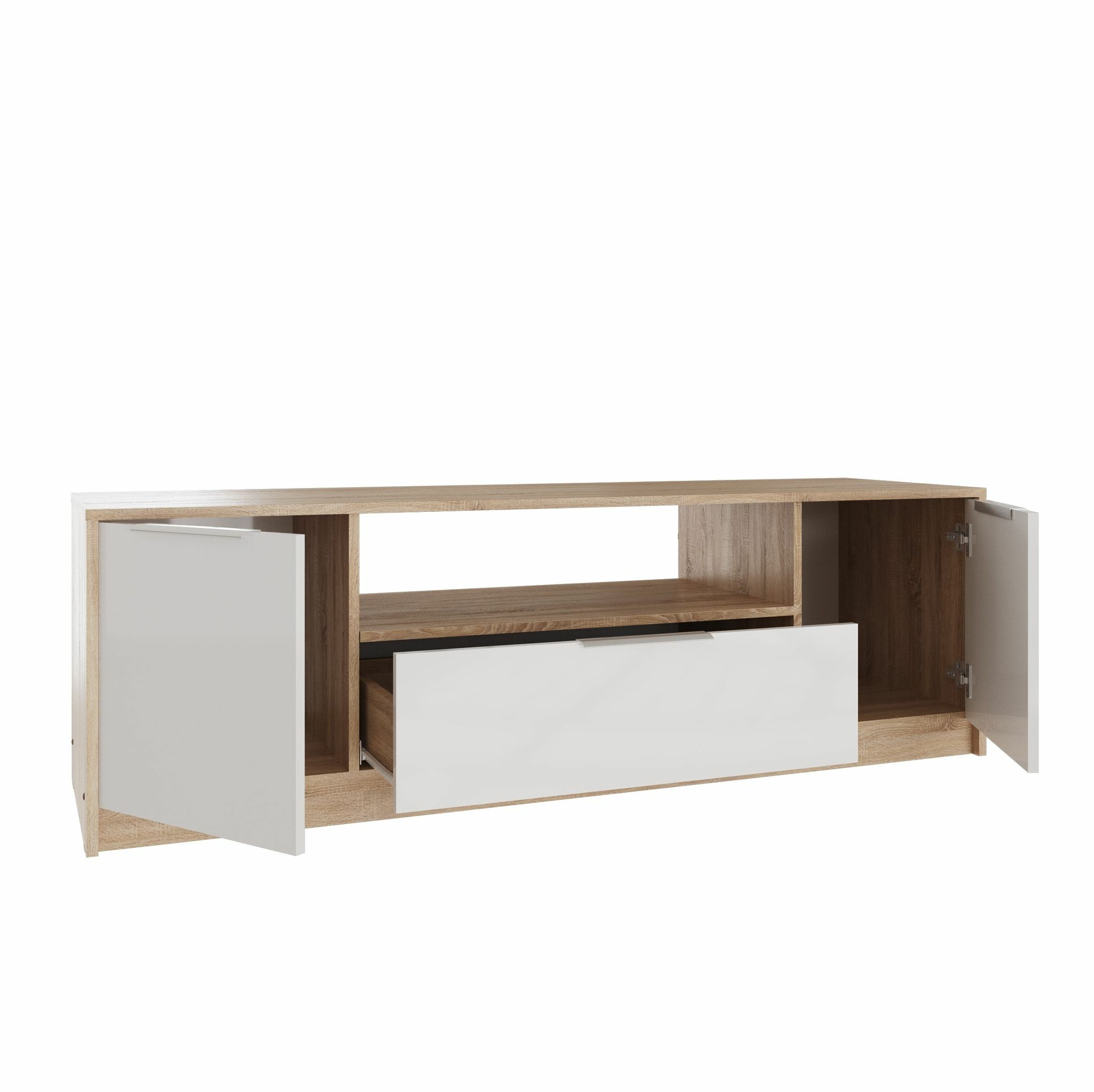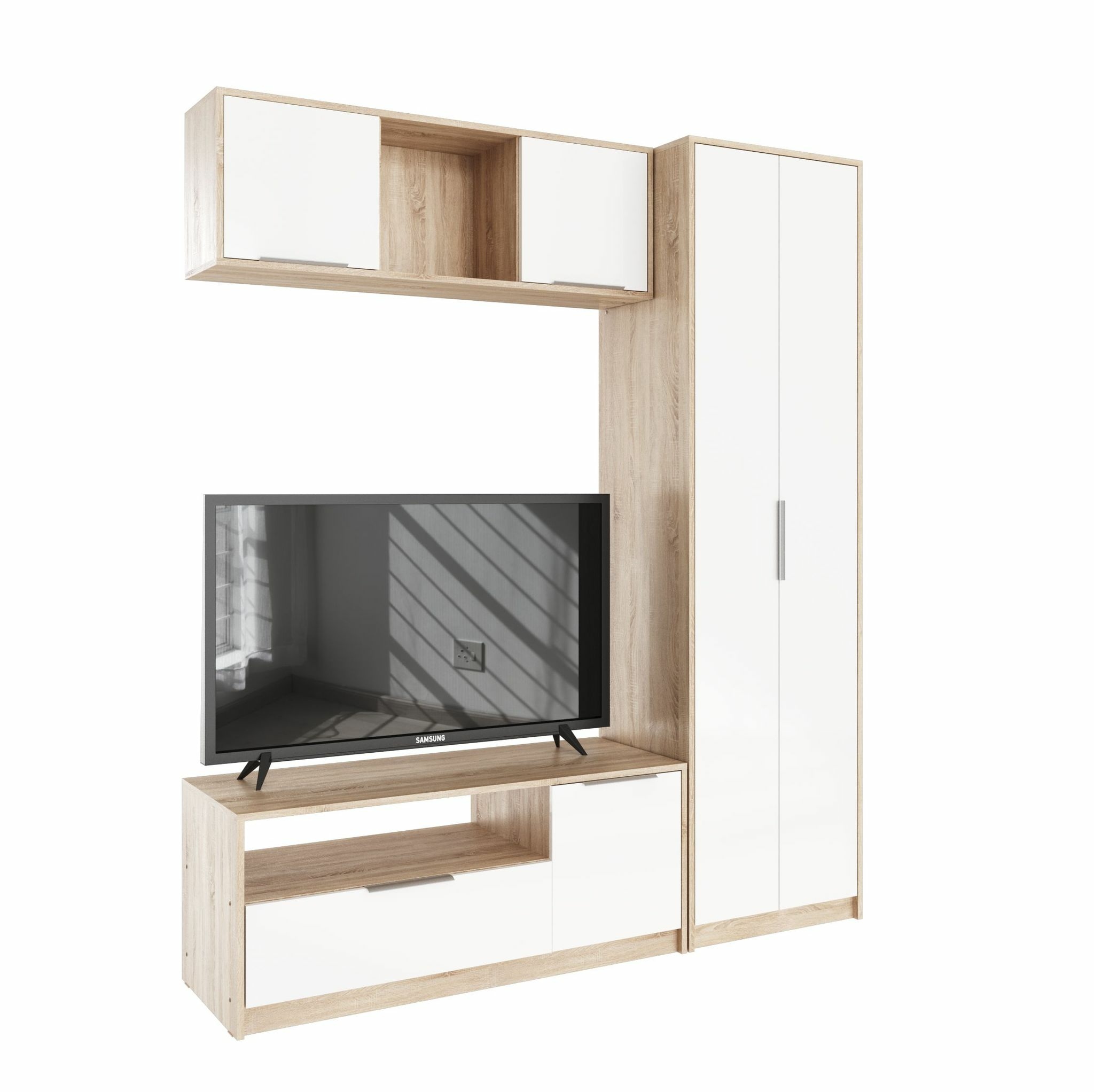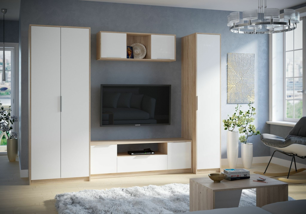 Комплект состоит из:Шкаф 2-х створчатый (803х575, h 2110 мм), Шкаф-пенал с полками (418х575, h 2110 мм), Тумба под ТВ-2 (1571х450, h 490 мм), Полка навесная закрытая (1187х269, h 404 мм), Журнальный столик (677х446, h 470 мм).