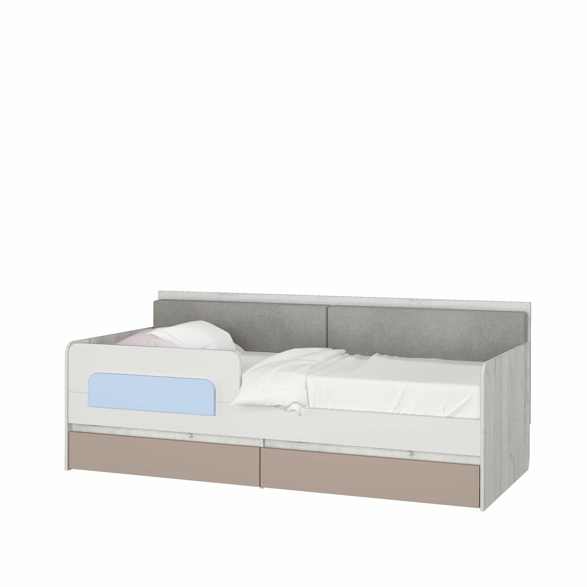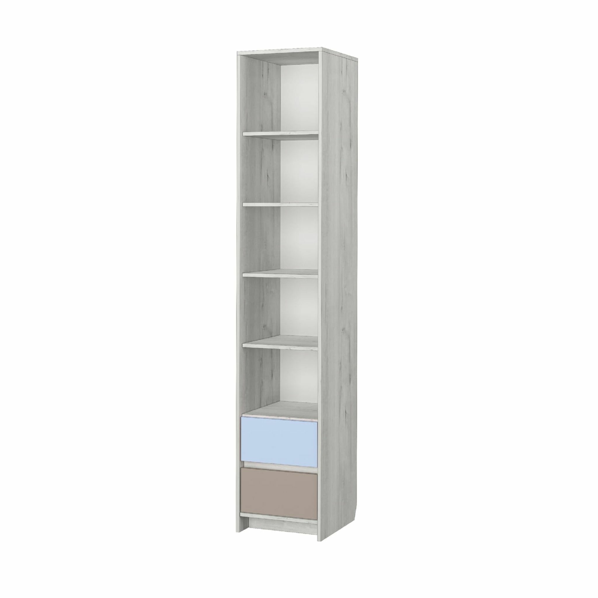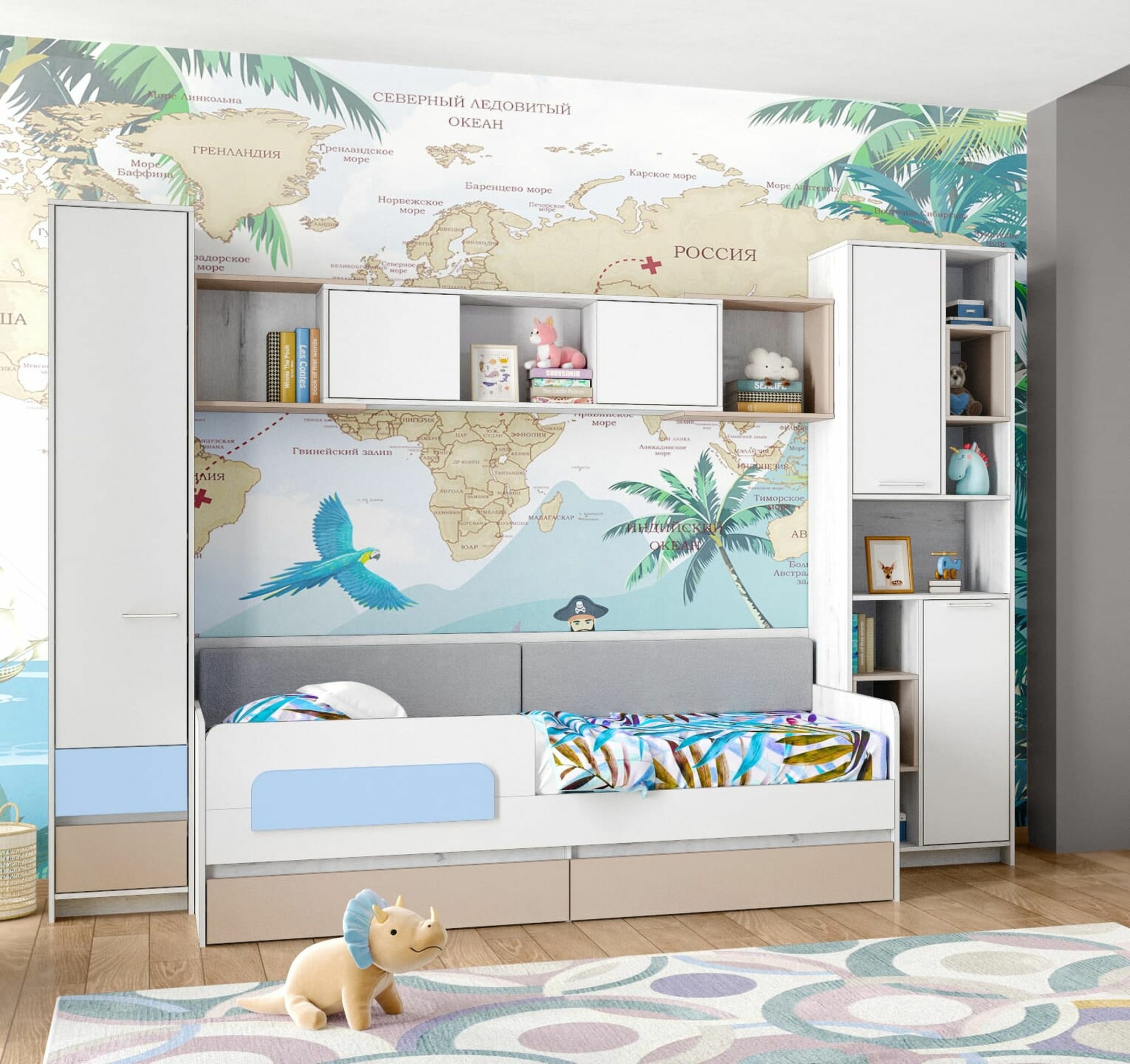 Комплект состоит из: Стеллаж 600 (Размеры:600х436, h 2100 мм), пенал с ящиками (Размеры:400х436, h 2100 мм), кровать-тахта (Размеры: 900х2000 h 805 мм, спальное место 900х2000 мм), полка навесная Пл-1 (Размеры:2040х300 h 400 мм).