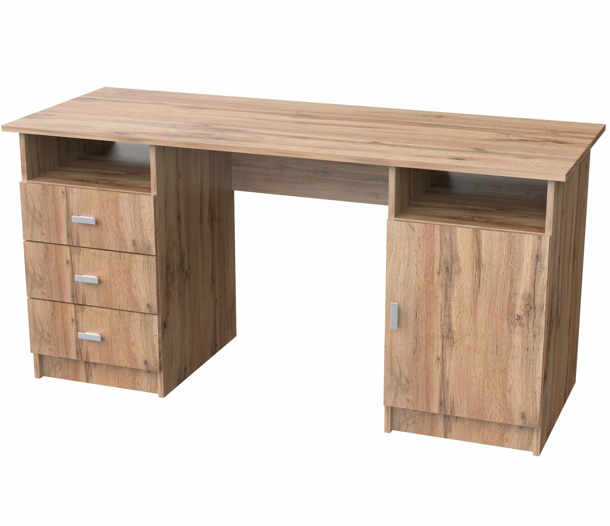 Стол СТ-8 изготовлен из ЛДСП.Оснащён 2-мя тумбами по бокам,одна тумба с дверью,за дверцей полка съёмная),другая оснащена выдвижными ящиками.Ширина 148,4 см,Выс 75 см,глуб 57 см.Удобен в использовании как для кабинета,так и для школьников.
