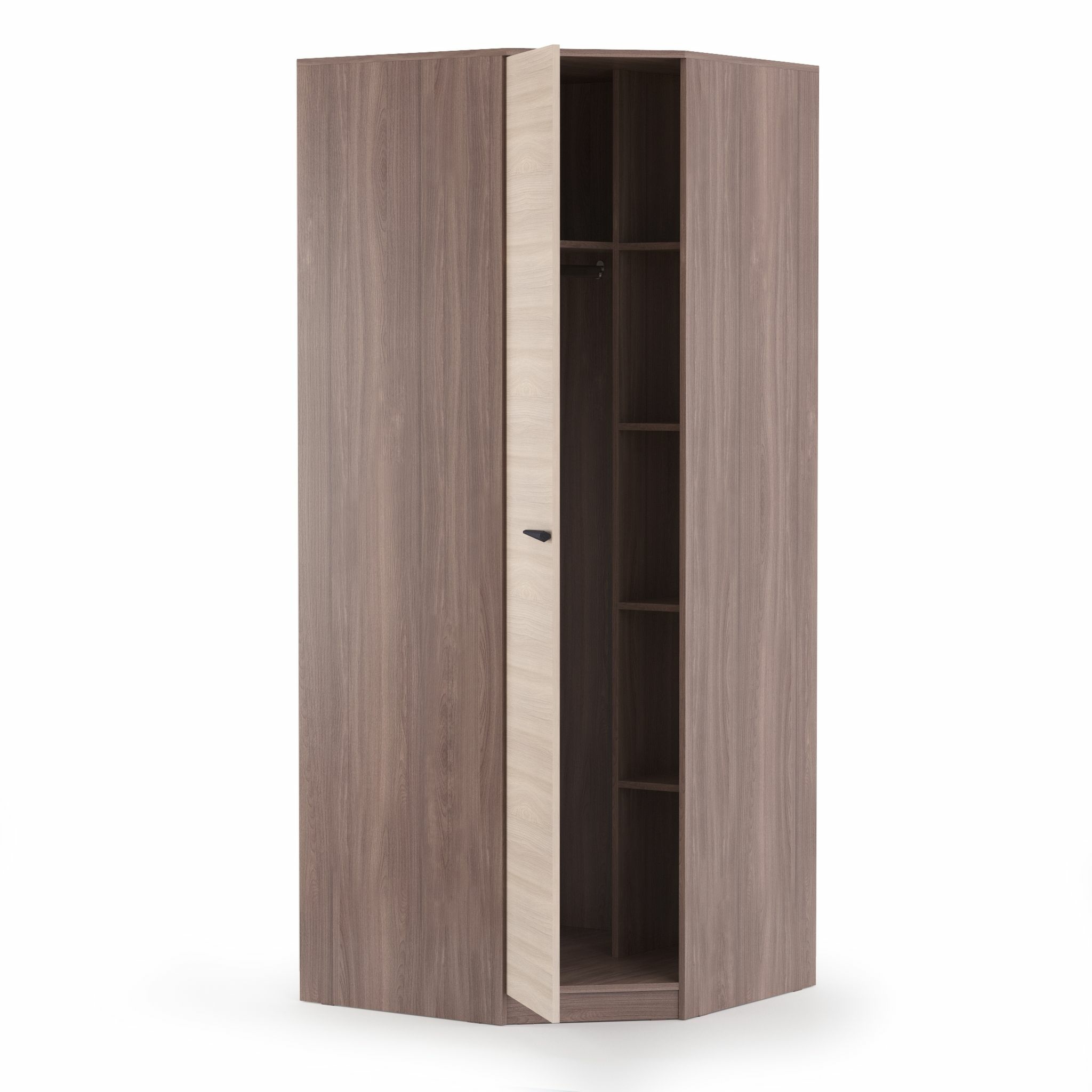 Шкаф угловой Оптимум - это вместительный, функциональный шкаф, выполненный в современном стиле. Шкаф можно поставить в гостиную, спальню, прихожую, он легко вписывается в любой современный интерьер. За распашной дверкой шкафа находятся две секции. Слева секция с о штангой для плечиков и антресольной полкой, справа секция с полками для вещей. Прекрасный угловой шкаф Оптимум будет содержать Ваши вещи в чистоте и порядке. Изготовлен из экологически чистых материалов.