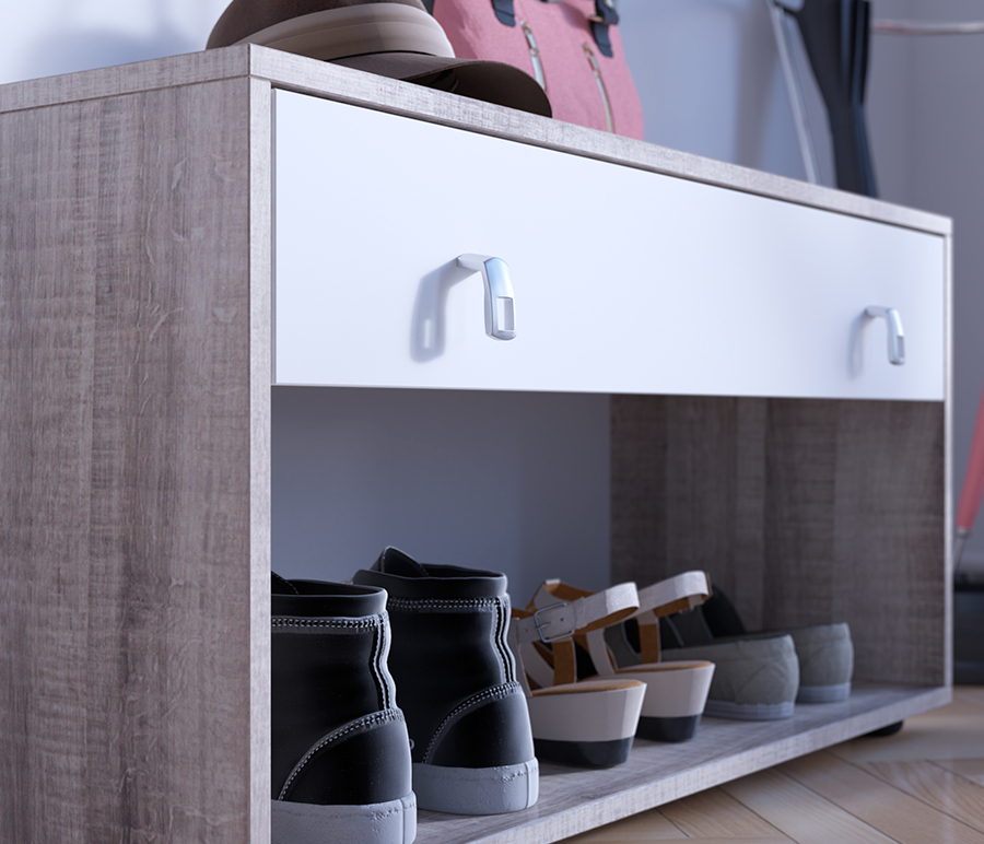 Узкая тумба в сочетании с зеркалом могут взять на себя функции трюмо. В ней имеется выдвижной ящик, где можно разместить полезные мелочи и нижнее отделение, пригодное для хранения обуви.