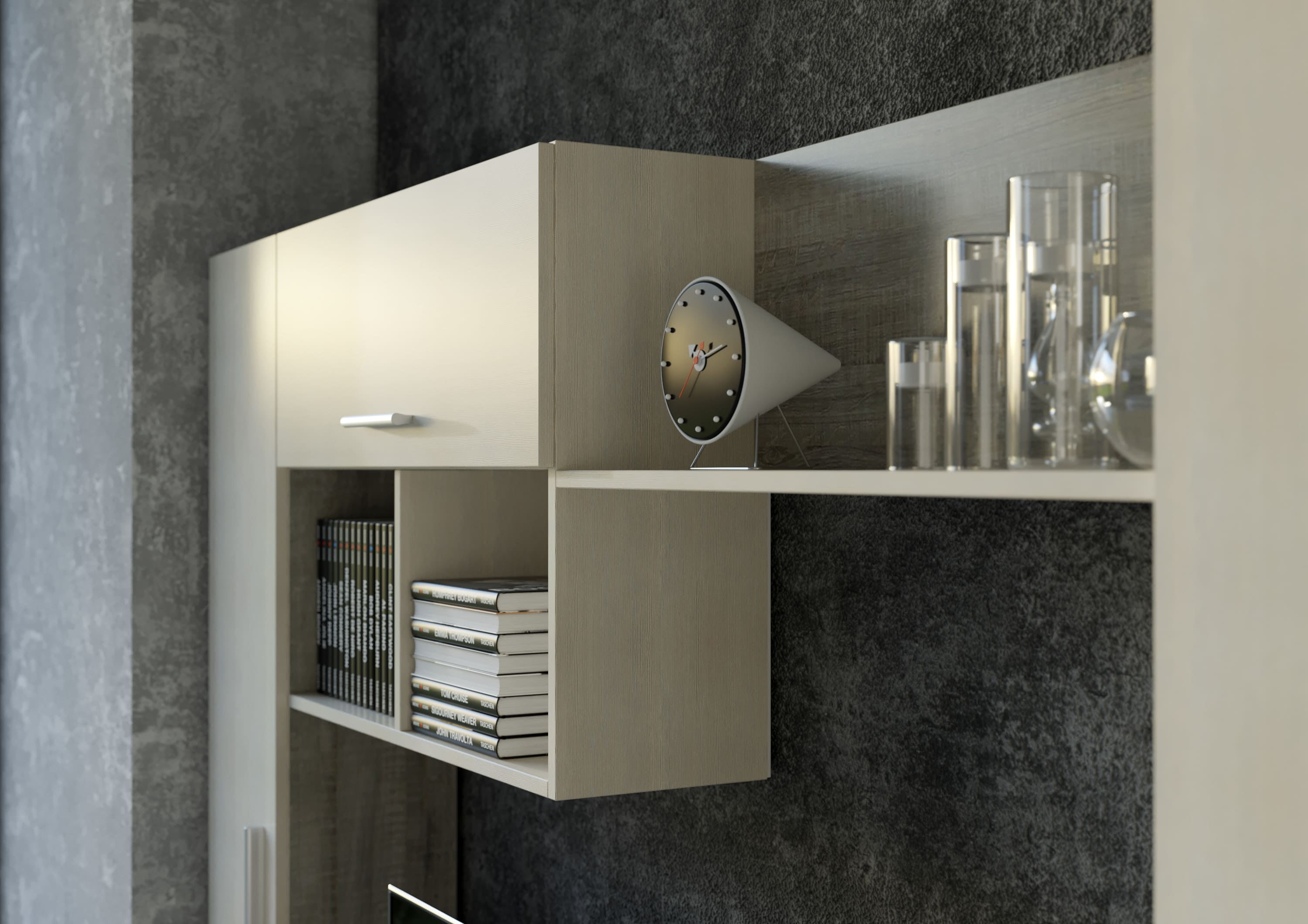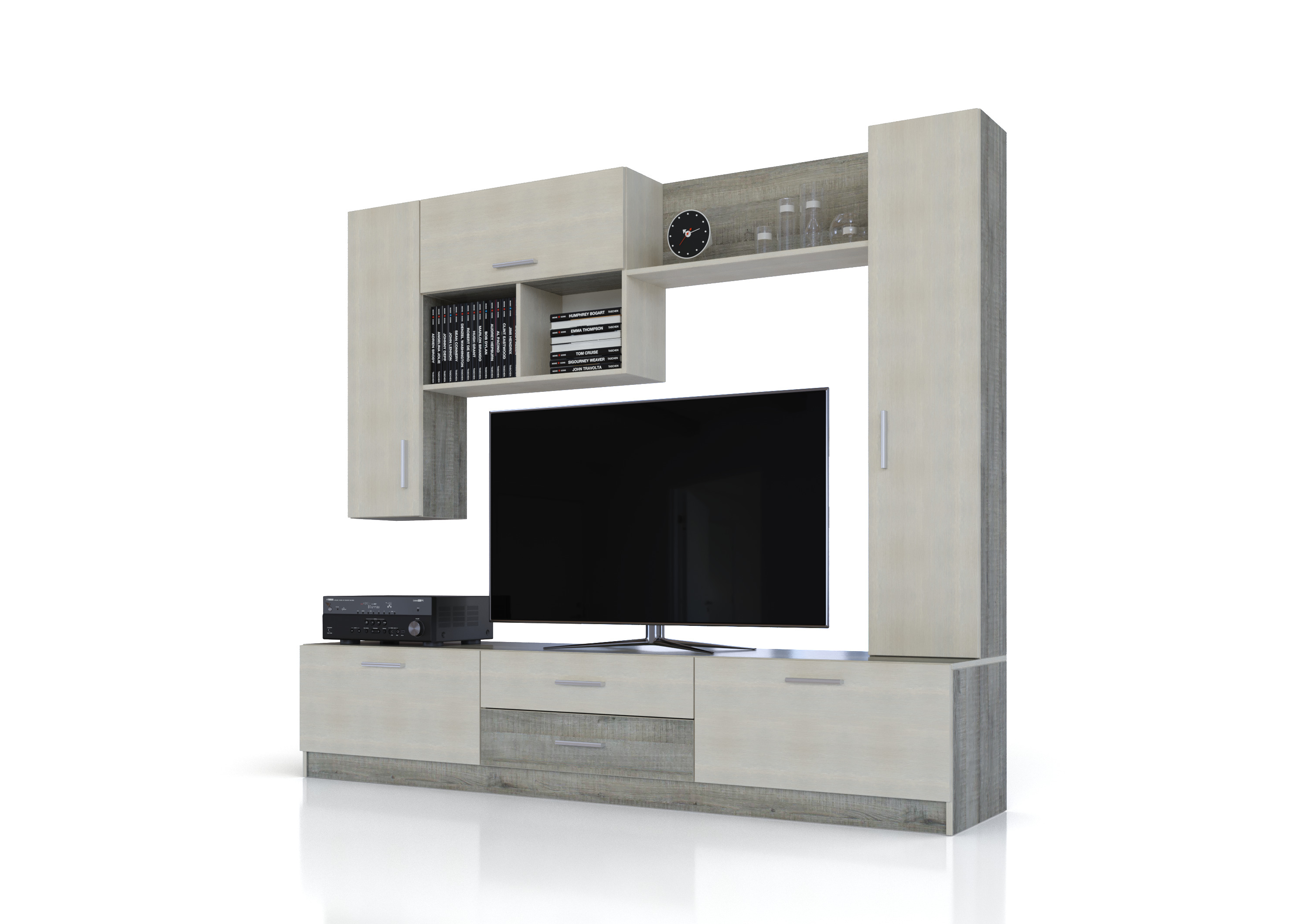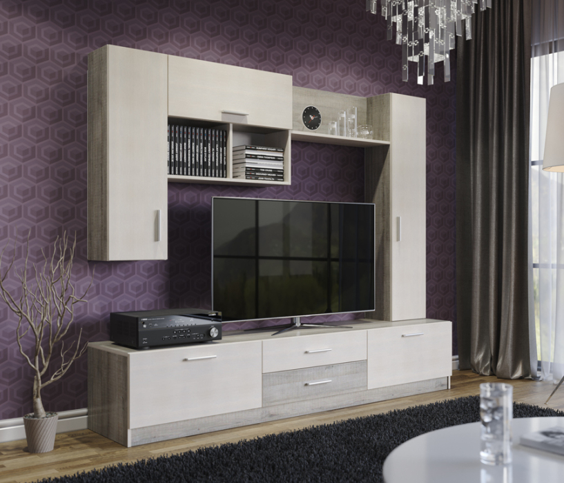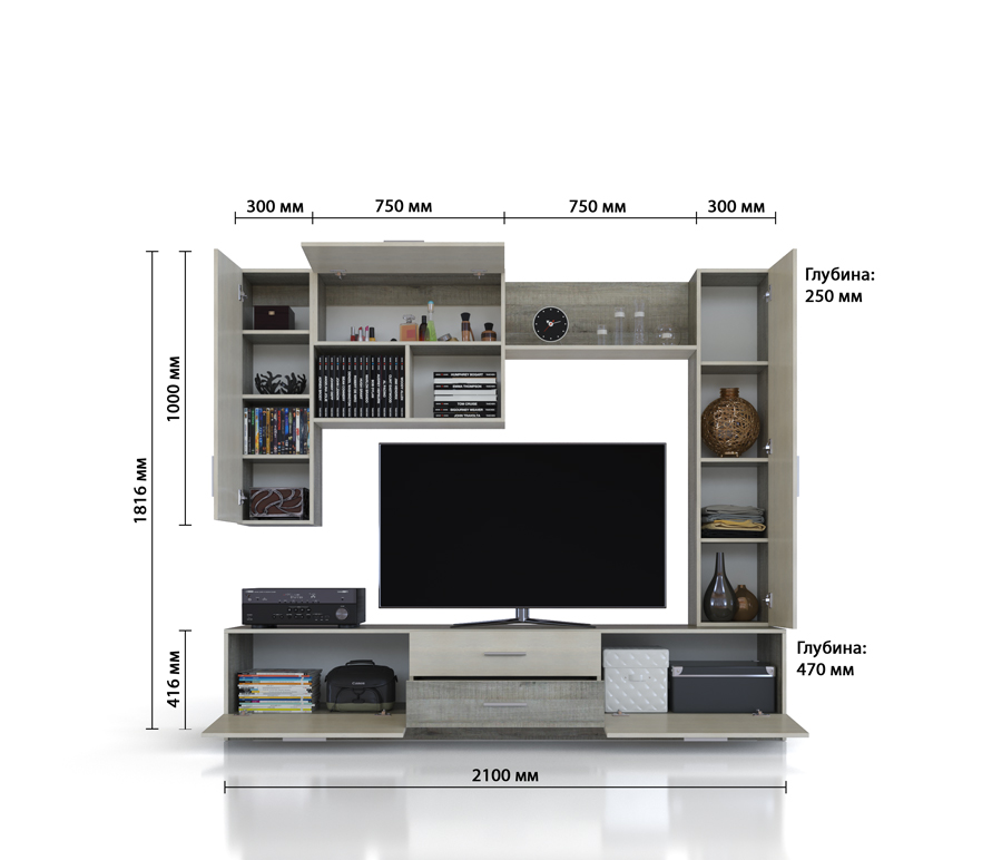 В наборе есть все необходимое: большая ТВ-тумба, вместительные пеналы и эргономичные полки.