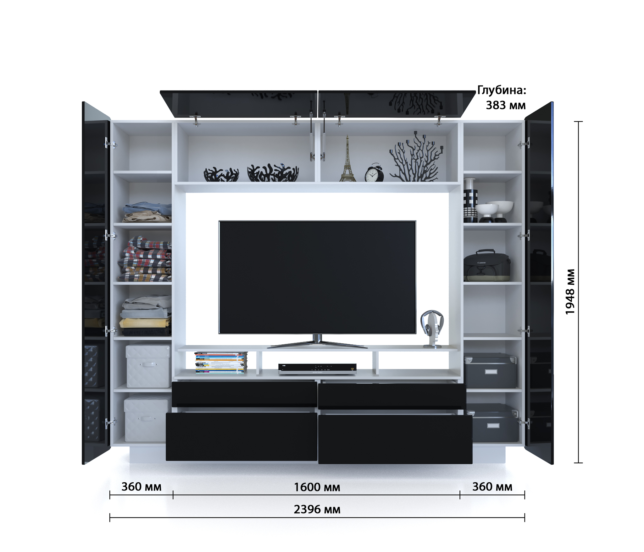 Новая ультрасовременная гостиная «Нео», создана для людей, которые ценят в мебели стиль и современные тенденции. Выполняется в белом цвете корпуса с глянцевыми фасадами из МДФ. В стенке есть все необходимое: большое отделение для телевизора, с диагональю до 60 дюймов (160 см); два вместительных стеллажа, две полки и четыре выдвижных ящика, которые открываются с помощью системы Push to open (открытие при нажатии на фасад). Габариты гостиной идеально впишутся в любой интерьер. Есть вариант с черными глянцевыми фасадами.