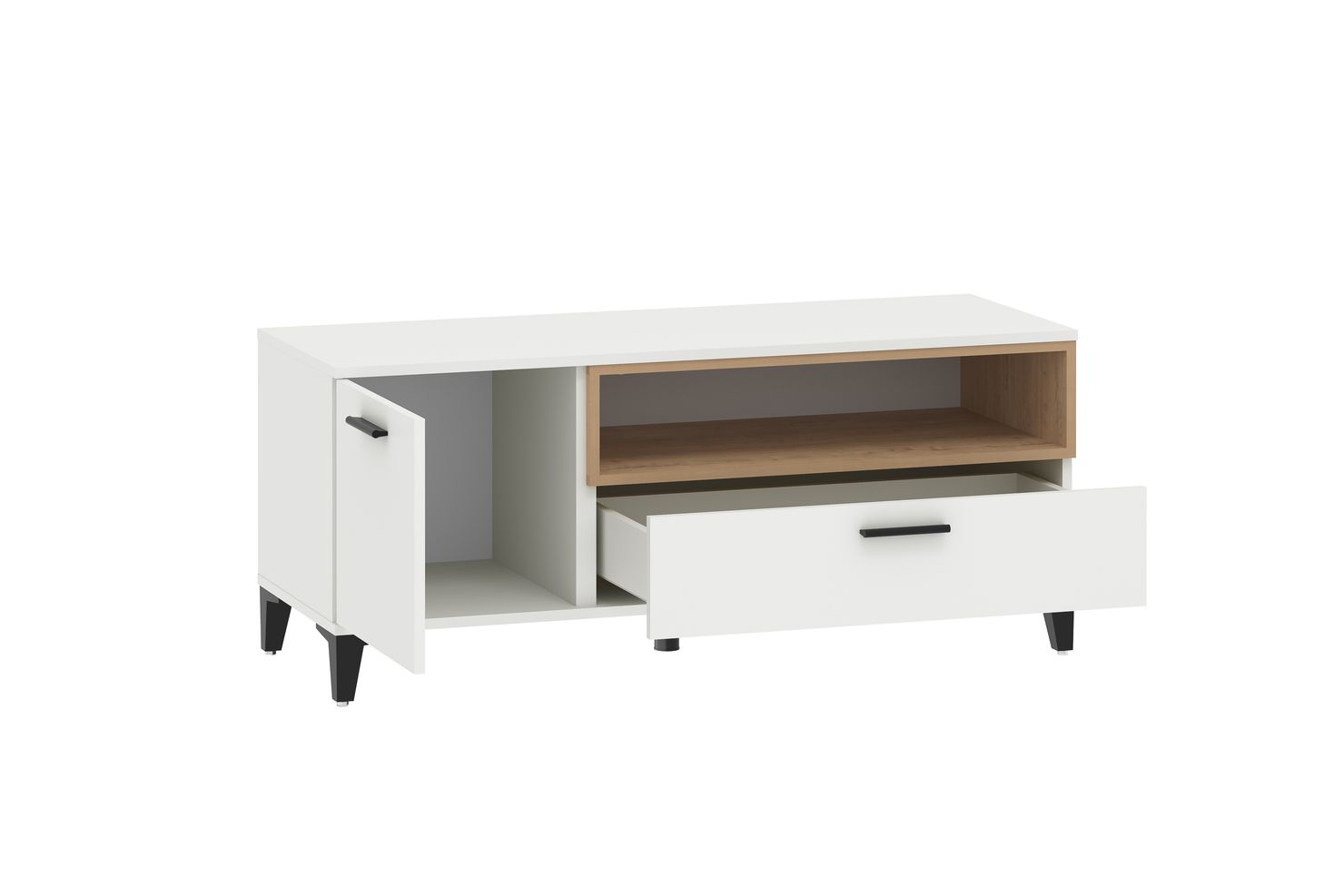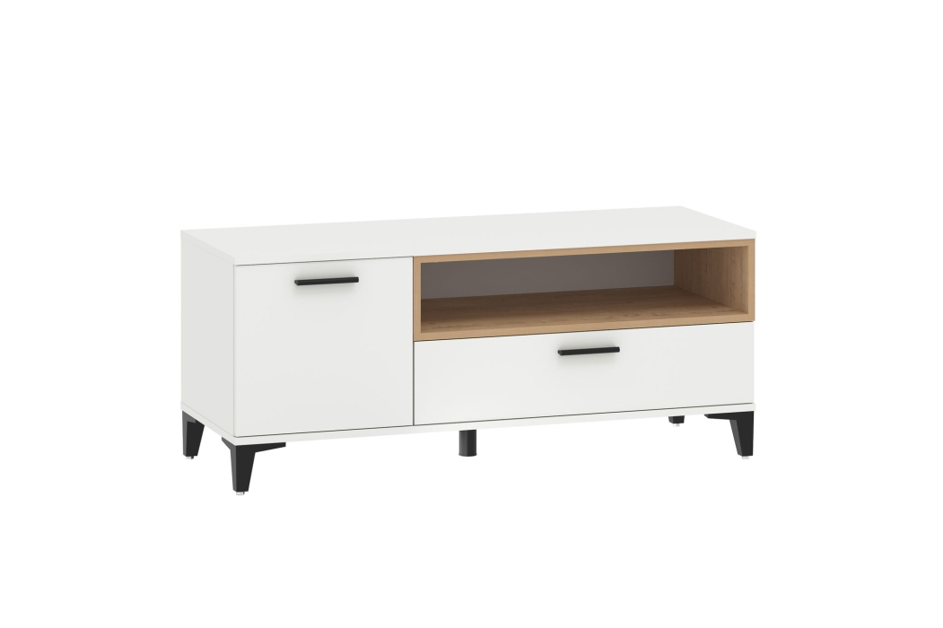 Конструкция с распашной дверцей, выдвижным ящиком и открытой полкой для техники.
