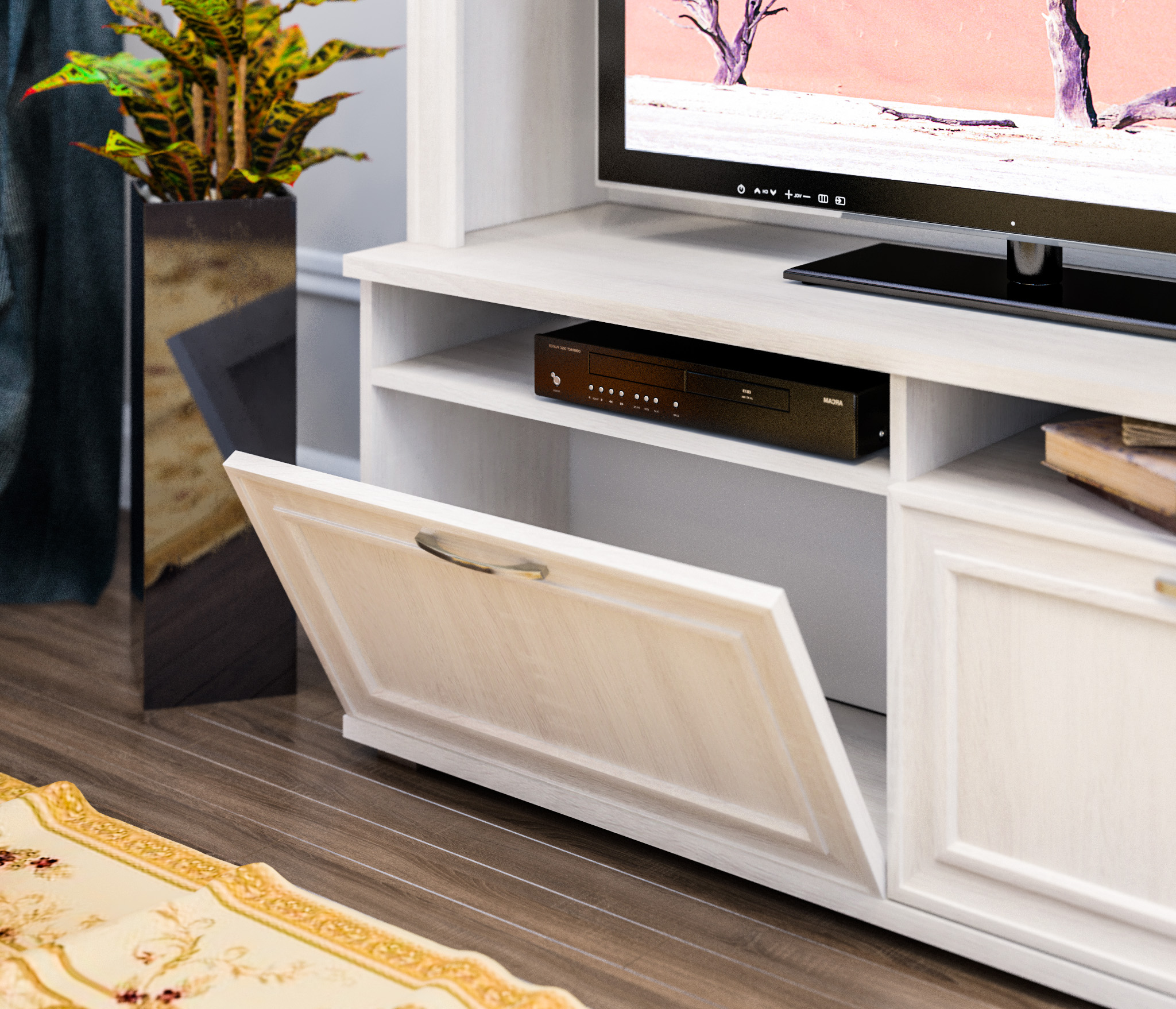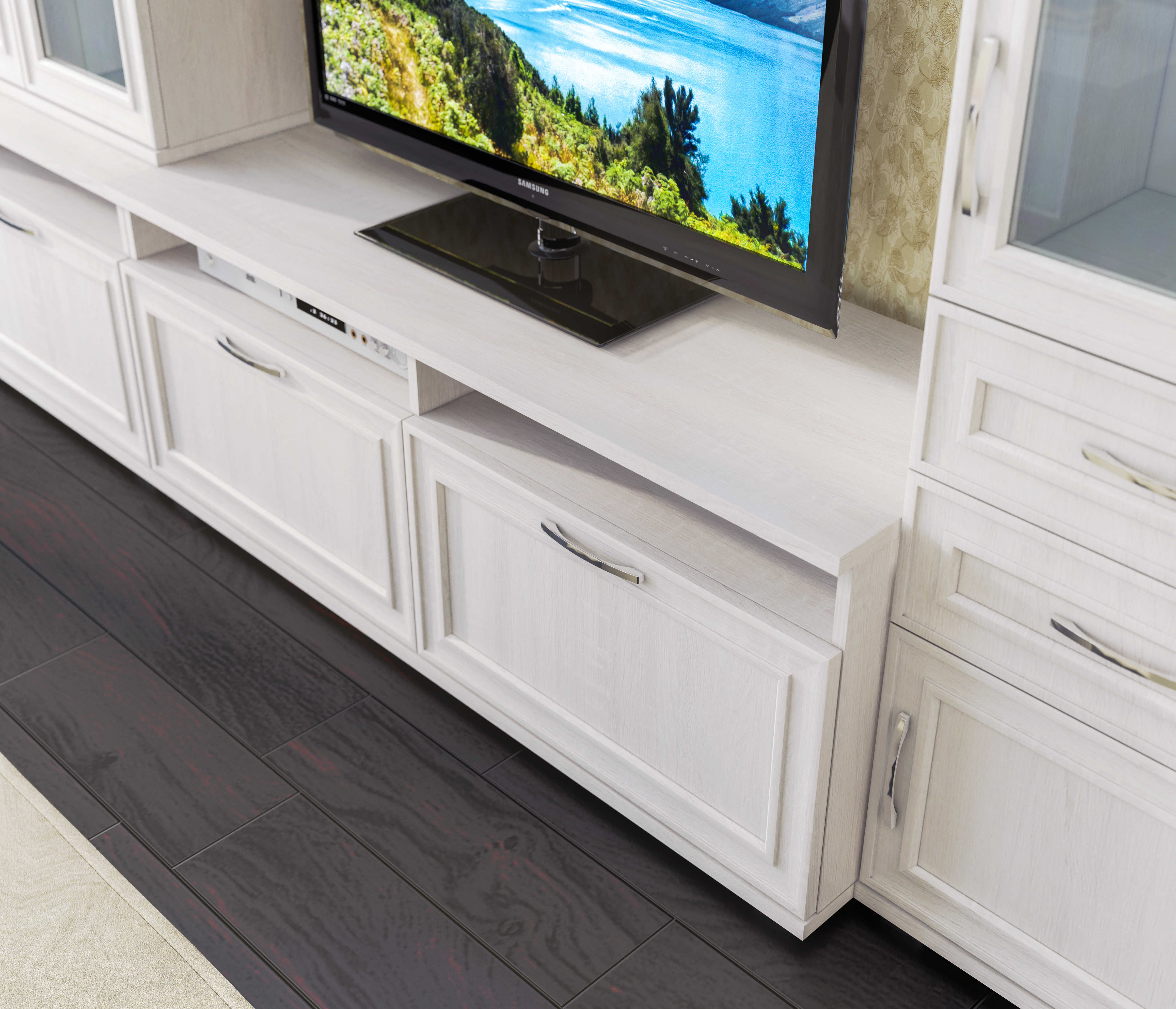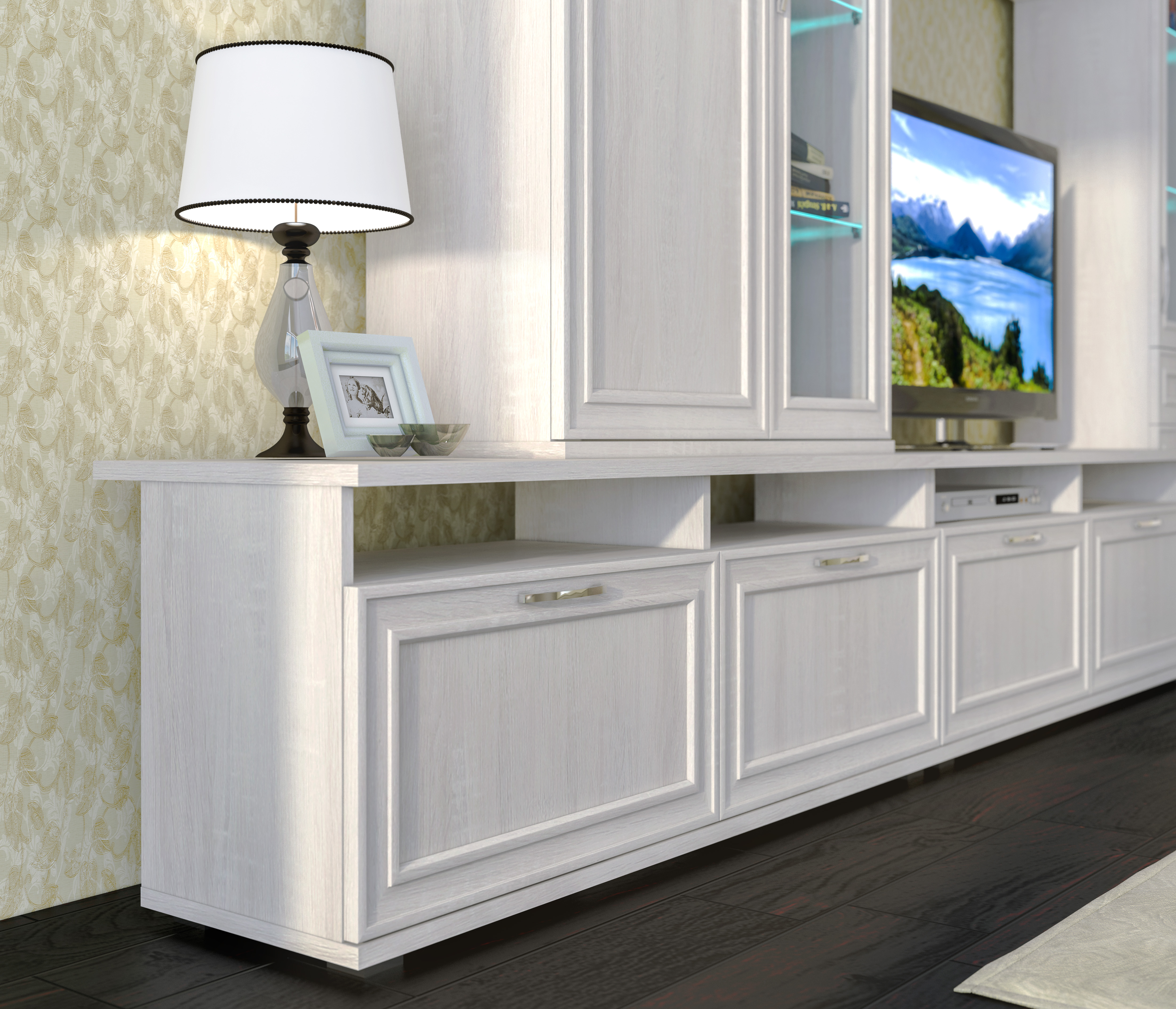 Тумба под телевизор Флоренция СБ-2406, выполненная в классическом дизайне, будет одинаково органично смотреться как в спальне, так и в кабинете или гостиной. Может быть элементом модульного гарнитура Флоренция. Габаритные размеры – ширина 132 см, высота 52 см, глубина 44 см. Визуально тумба делится на два симметричных отделения. Под столешницей расположены открытые полки, под ними отделения за отдельными дверцами. Корпус тумбы производится из экологичного материала – КДСП, рамочные фасады - из МДФ. Материал отделки в цвете «Дуб Сонома белый» не уступает по тактильным ощущениям природному дереву.