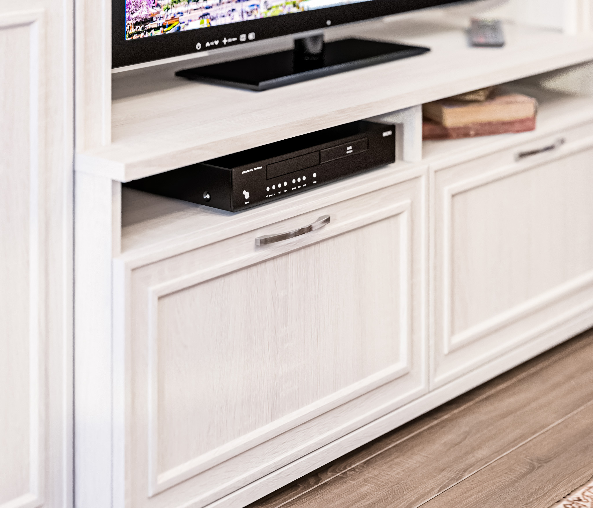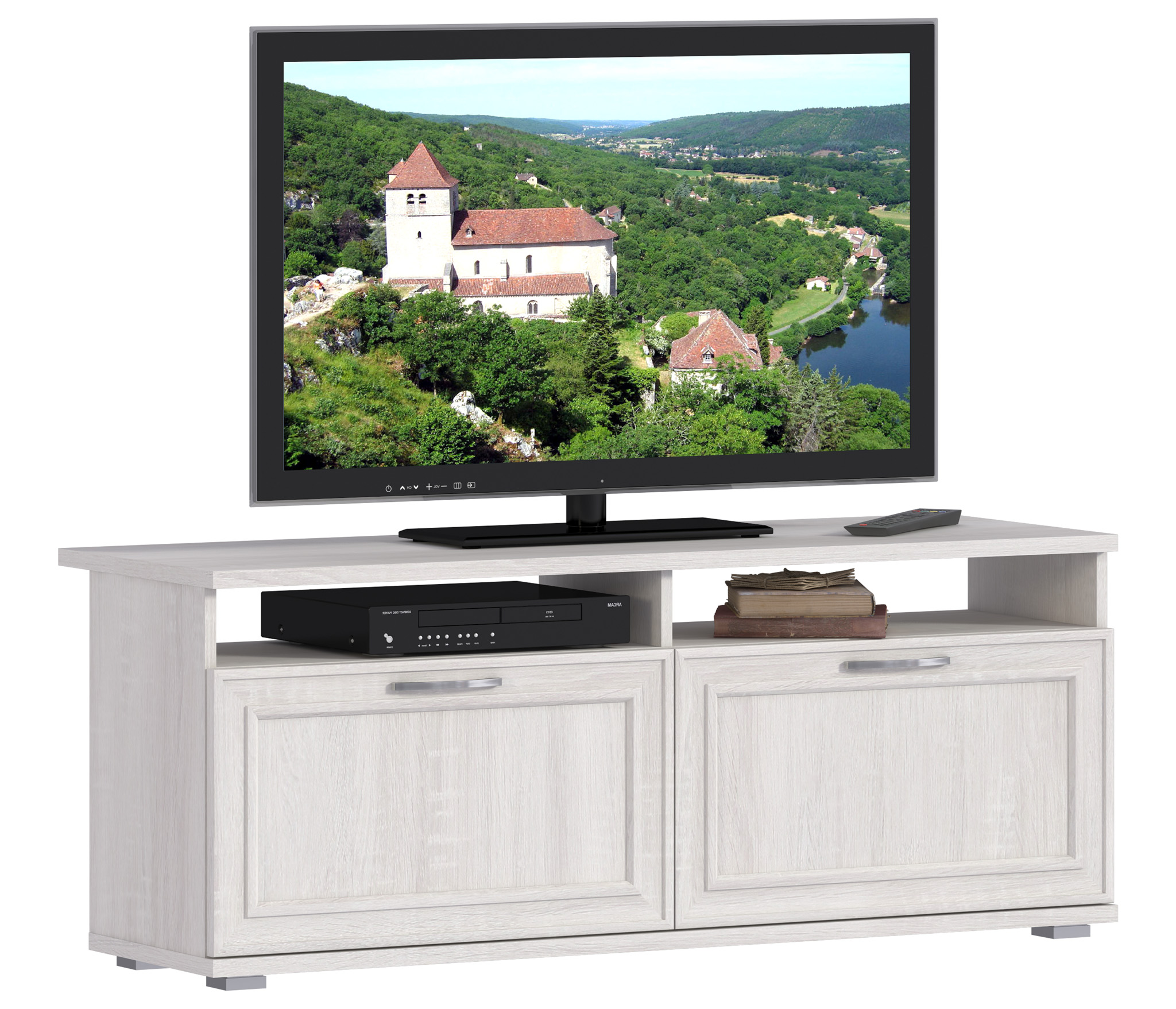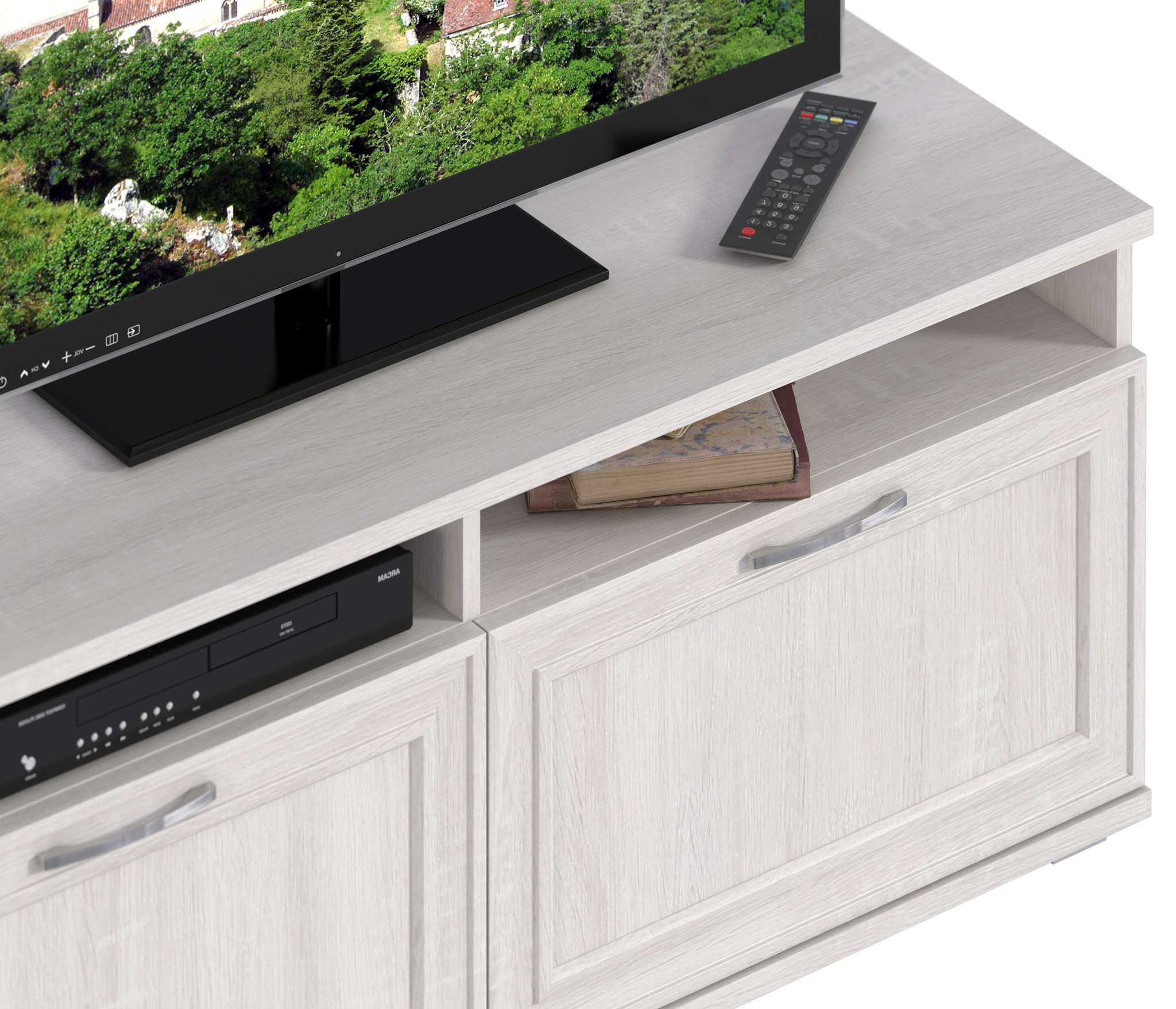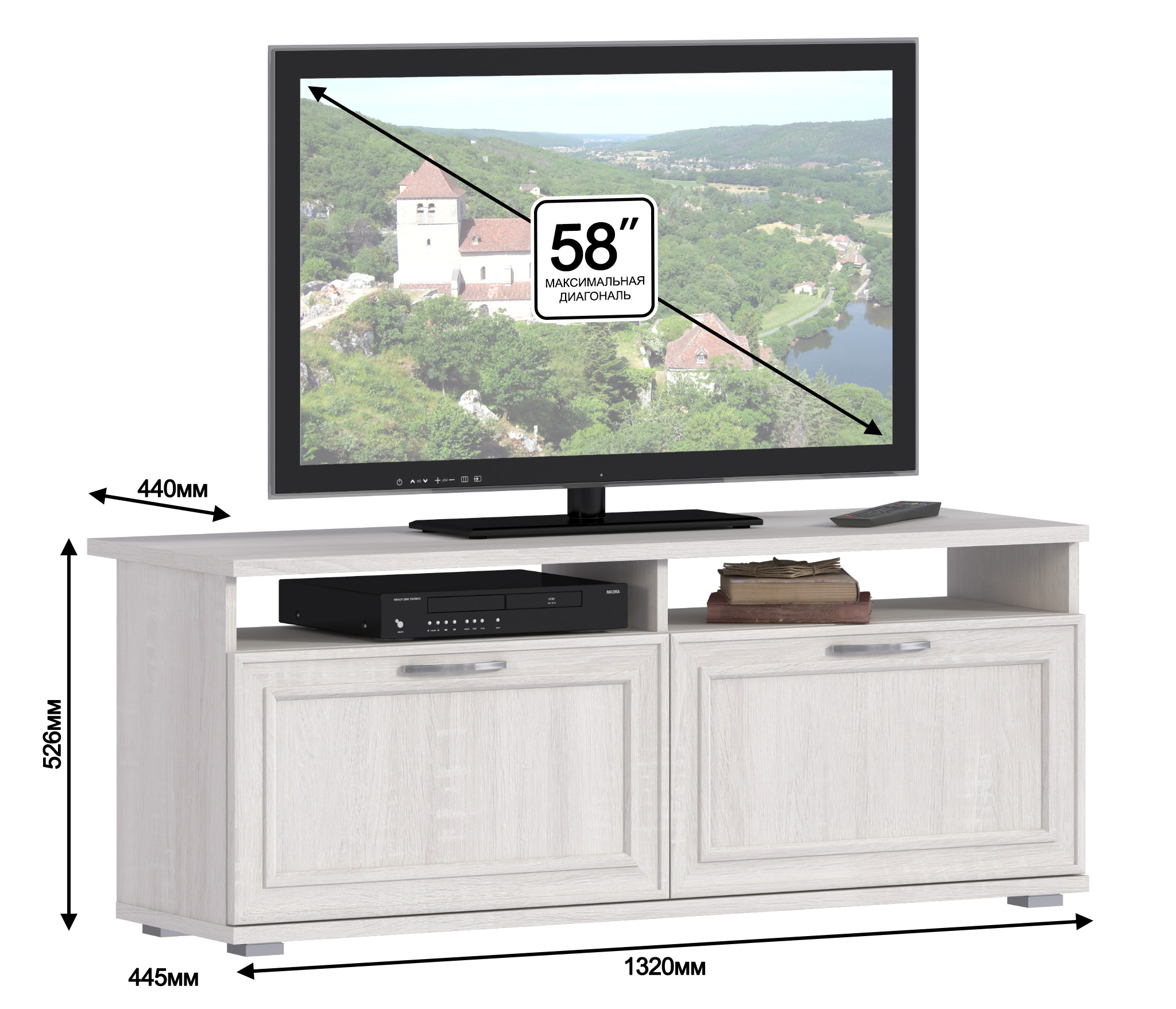 Тумба под телевизор Флоренция СБ-2406, выполненная в классическом дизайне, будет одинаково органично смотреться как в спальне, так и в кабинете или гостиной. Может быть элементом модульного гарнитура Флоренция. Габаритные размеры – ширина 132 см, высота 52 см, глубина 44 см. Визуально тумба делится на два симметричных отделения. Под столешницей расположены открытые полки, под ними отделения за отдельными дверцами. Корпус тумбы производится из экологичного материала – КДСП, рамочные фасады - из МДФ. Материал отделки в цвете «Дуб Сонома белый» не уступает по тактильным ощущениям природному дереву.