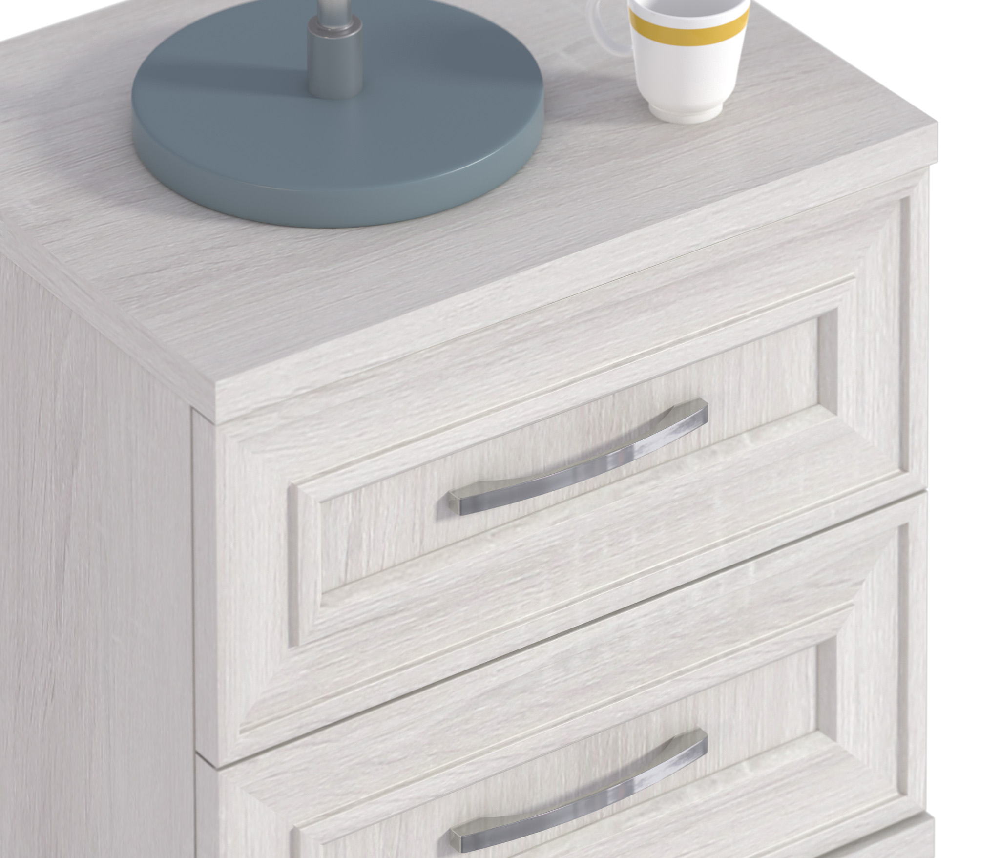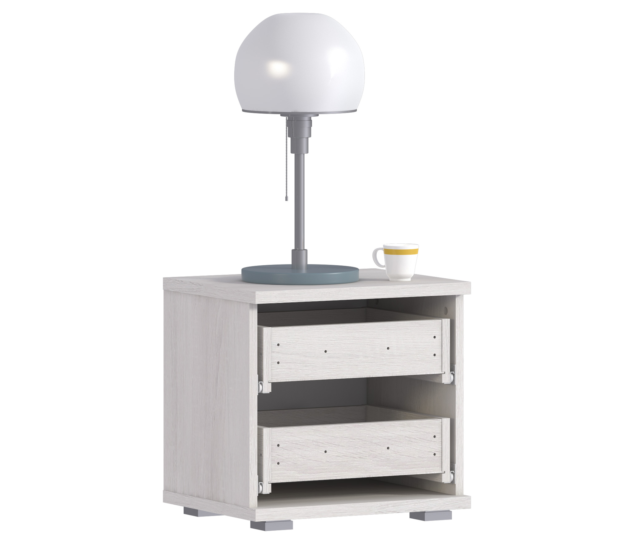 Габаритные размеры тумбы – ширина 44 см, высота 42 см и глубина 35 см. Под столешницей расположены два выдвижных ящика.Корпус и фасады тумбы выполнены из современного и прочного КДСП в цвете «Дуб Сонома Белый». Металлическая ручка-скоба в цвете хром.