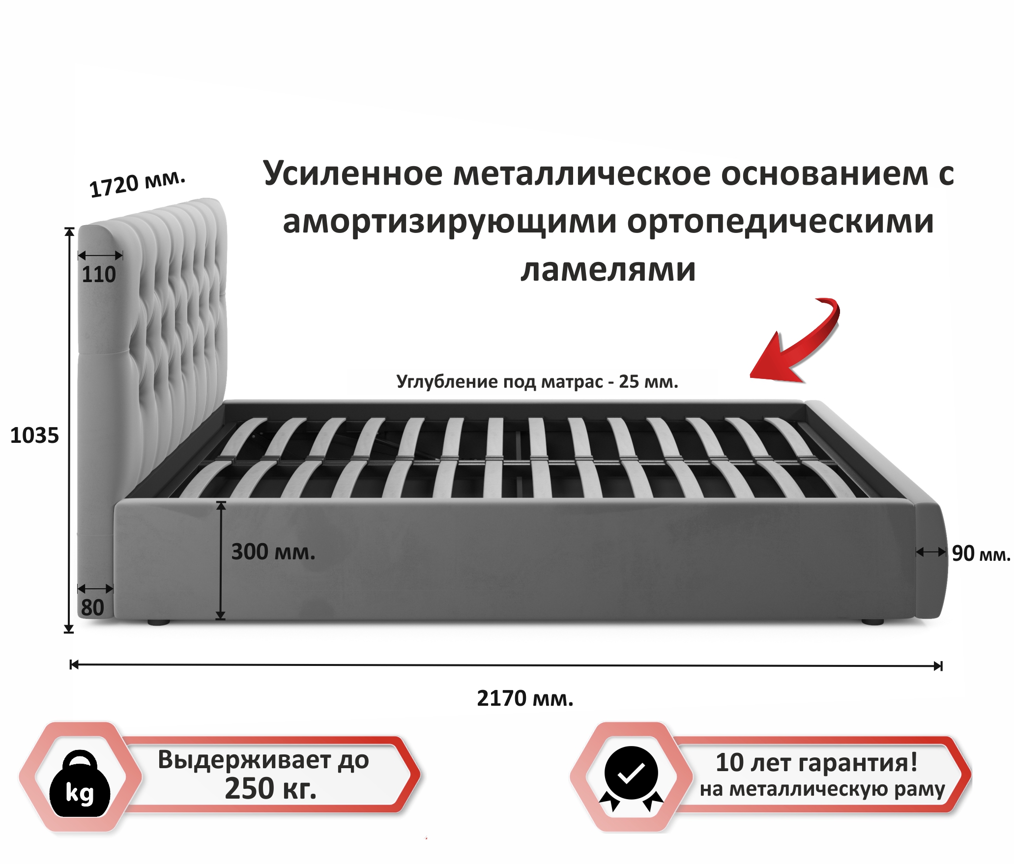 Благодаря использованию материалов повышенной износостойкости кровать легко выдерживает нагрузку до 250 кг.