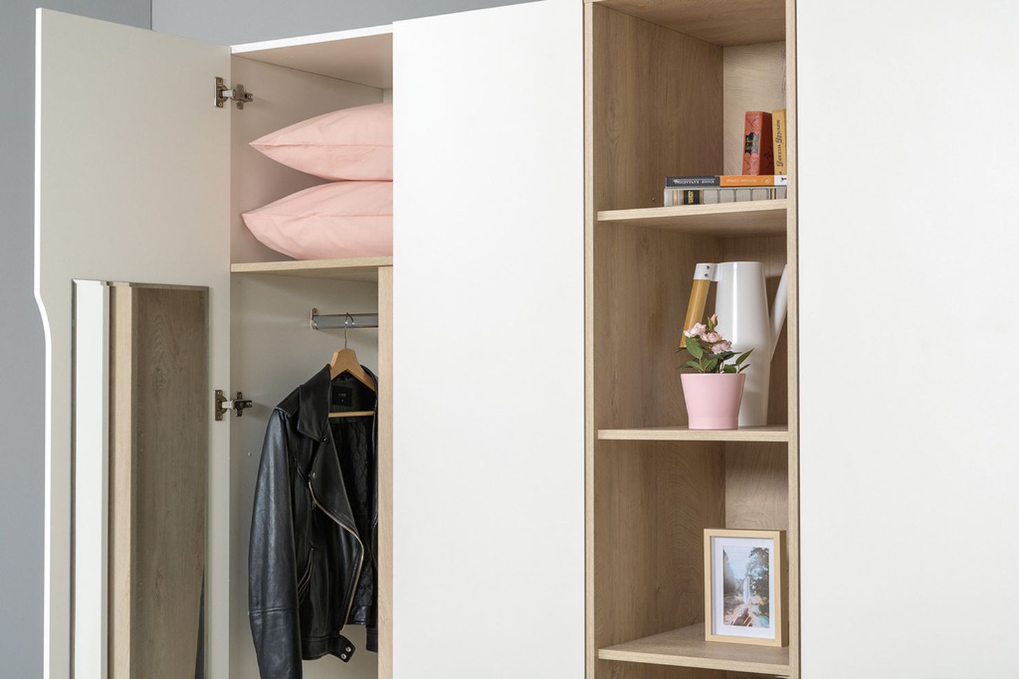 стороны дверцы находится зеркало. Сборка наполнения шкафа на любую сторону.