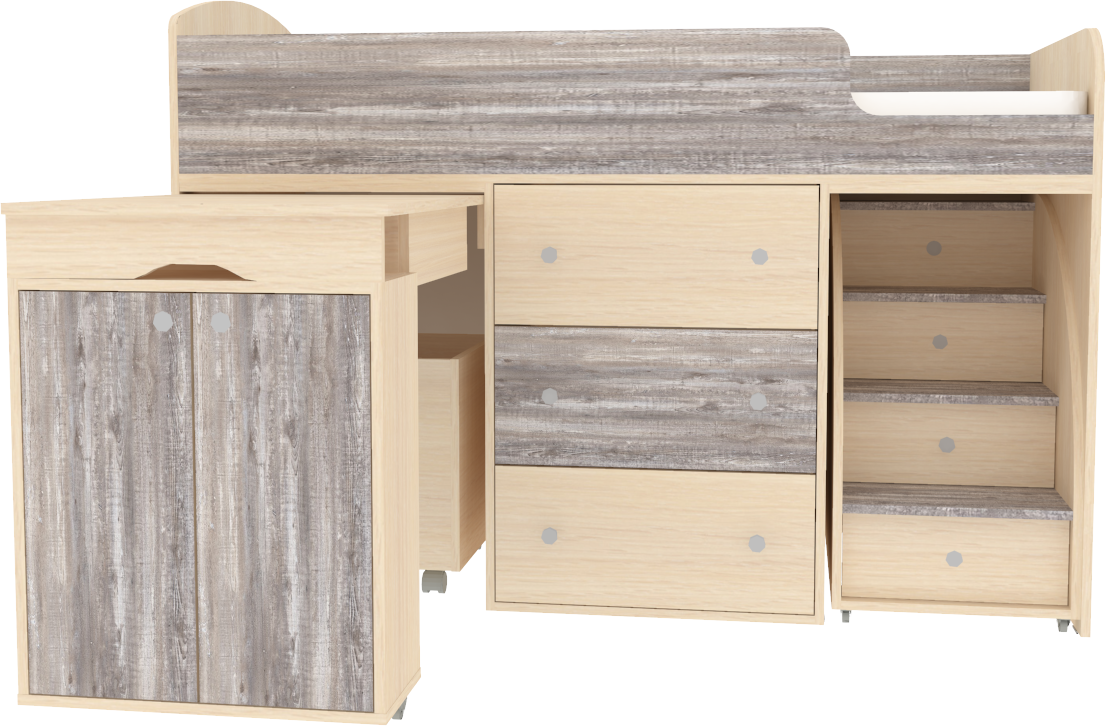 Кровать чердак Малыш Увеличенный - удобный, компактный и функциональный комплект детской мебели, включающий кровать Малыш на «чердаке», комод, выдвижной стол, лестницу с выдвижными ящиками и отделение для игрушек на колёсах, который легко убирается под кровать. Удобное спальное место наверху со специальным ограждением для безопасности сделает сон комфортным. При желании можно нарастить бортик. Отличие от стандартного малыш в увеличенном размере спального места. Благодаря огромному выбору цветового решения, вы подберете именно ту модель, которая понравится вашему ребенку. Такая кровать поразит вас своей компактностью, вместительностью и практичностью. Комплекс рассчитан на детей в возрасте от 2,5 до 15 лет. Все это в разнообразном цветовом исполнении и подойдет как для девочки, так и для мальчика. Кроватка универсальная, собирается как на левую, так и на правую сторону. На цветных фасадах: цвет кромки - бежевый.