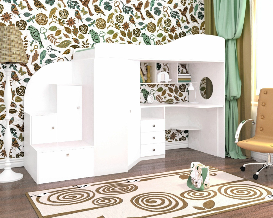 Материалы, используемые при изготовлении: Ламинированная ДСП, края лестницы, борта кровати декорированы противоударной кромкой ПВХ. На цветных фасадах: цвет кромки - бежевый.
