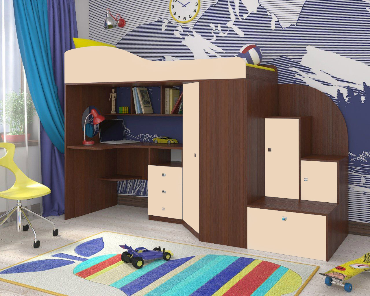 Материалы, используемые при изготовлении: Ламинированная ДСП, края лестницы, борта кровати декорированы противоударной кромкой ПВХ. На цветных фасадах: цвет кромки - бежевый.