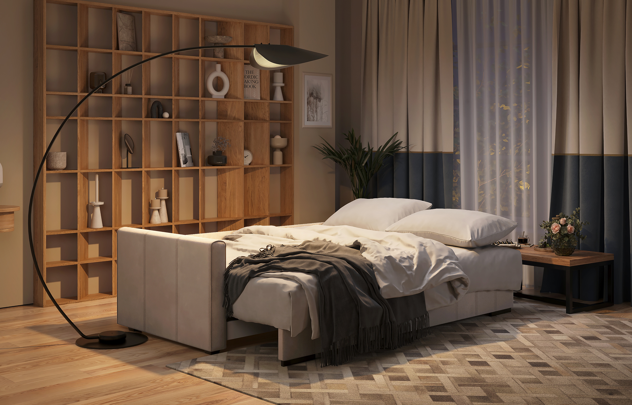 Небольшое в ширину спальное место в не разобранном состоянии.