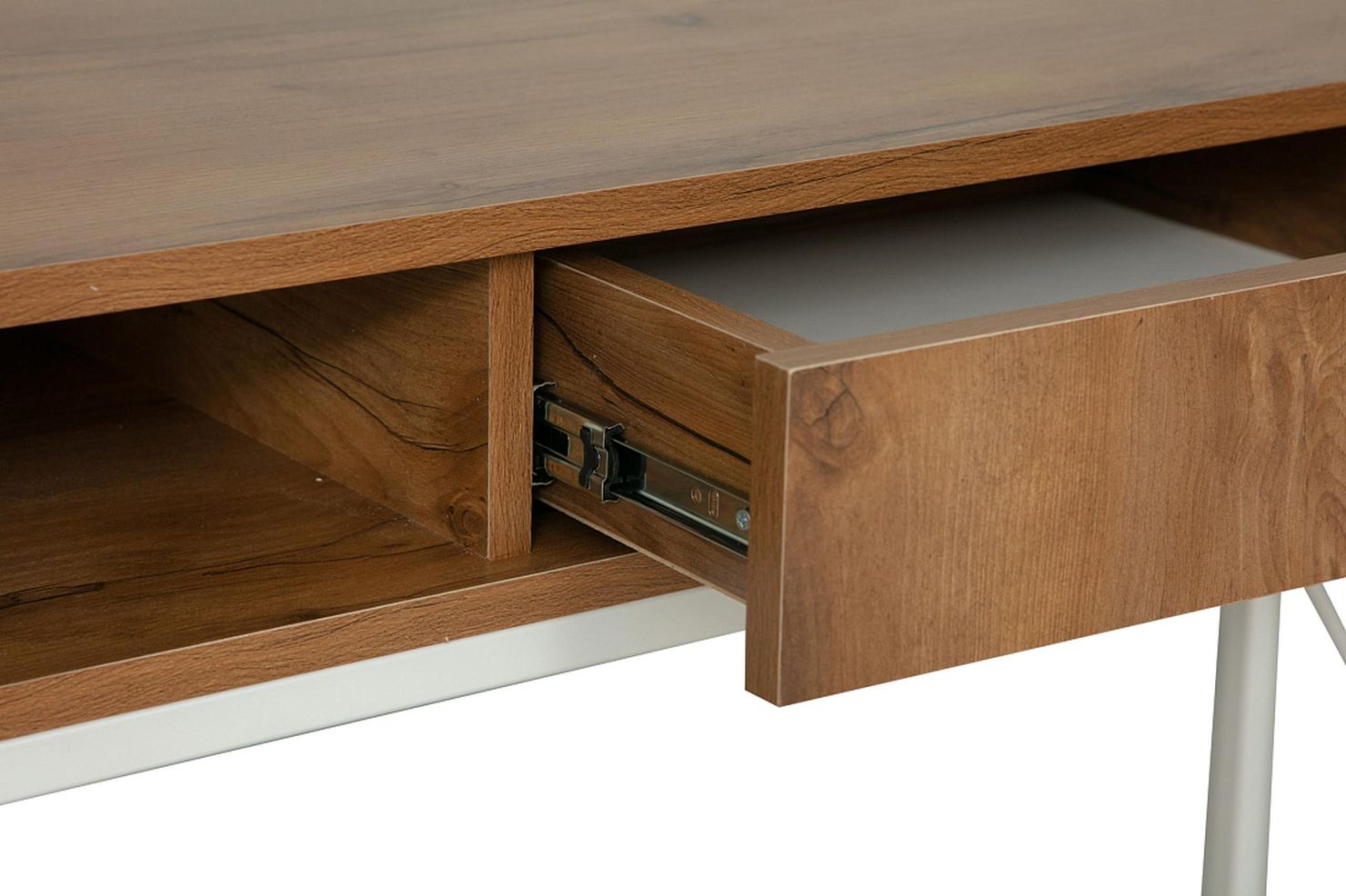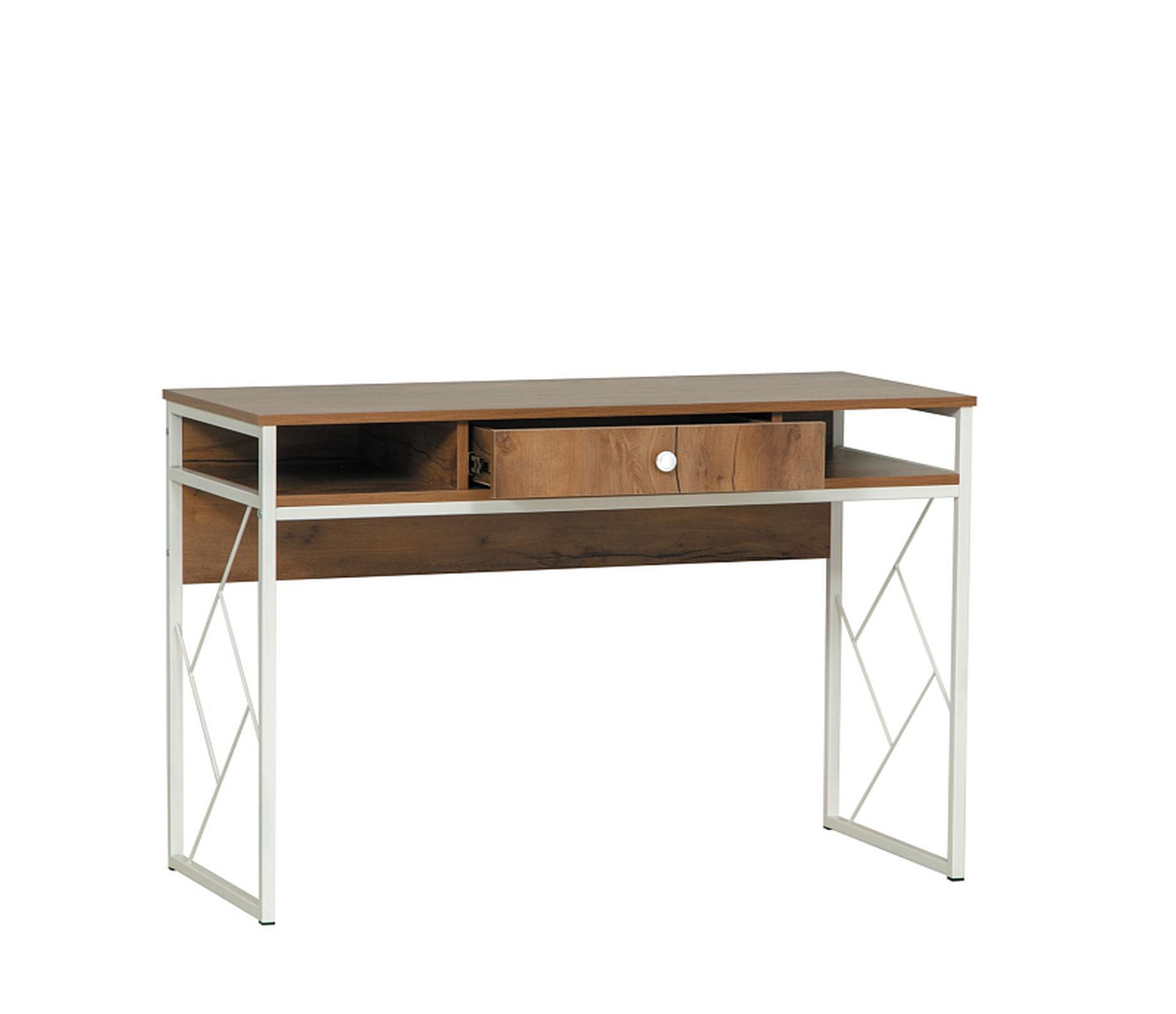 Стол имеет выдвижной ящик и металлические ножки.