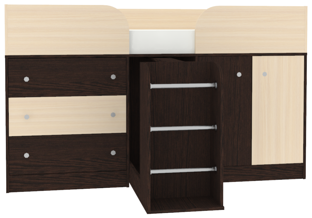 Малогабаритная и многофункциональная детская мебель с удобной кроватью, для Вашего ребенка. Покупая ребенку кровать чердак Малыш 4 Вы сделаете детскую самым необычным местом в доме, добавьте в нее насыщенных красок и приведите малыша в абсолютный восторг. Кровать чердак Малыш 4 решает проблему малого пространства сочетая в себе целый ряд функций: кровать, большой шкафчик для вещей или игрушек, комод с 3-я глубокими ящиками, а так же выдвижную лестницу-гардероб. Мебель изготовлена из ламинированного ДСП, с использованием кромки АБС, что позволяет продлить срок службы изделию и сохранить внешний вид.