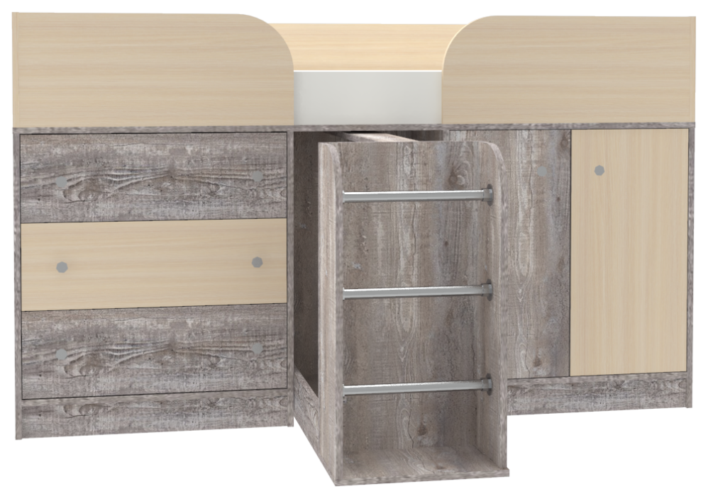 Малогабаритная и многофункциональная детская мебель с удобной кроватью, для Вашего ребенка. Покупая ребенку кровать чердак Малыш 4 Вы сделаете детскую самым необычным местом в доме, добавьте в нее насыщенных красок и приведите малыша в абсолютный восторг. Кровать чердак Малыш 4 решает проблему малого пространства сочетая в себе целый ряд функций: кровать, большой шкафчик для вещей или игрушек, комод с 3-я глубокими ящиками, а так же выдвижную лестницу-гардероб. Мебель изготовлена из ламинированного ДСП, с использованием кромки АБС, что позволяет продлить срок службы изделию и сохранить внешний вид.