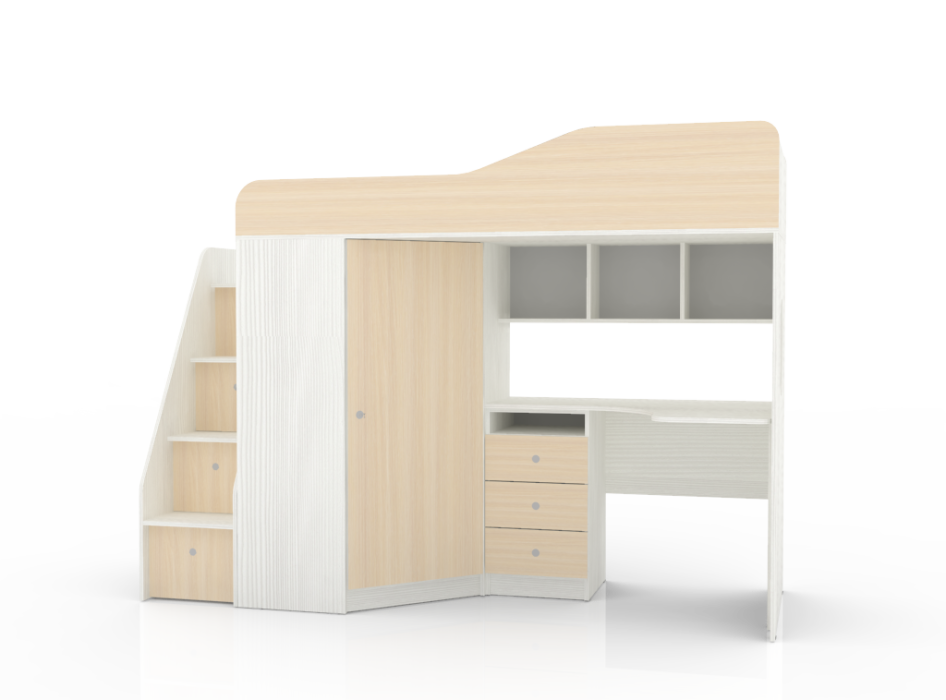 - Стеллаж для книг под спальным местом Основные параметры: - Кроватный модуль, размеры (Д*Г*В): 2332*832*1716 мм. - Спальное место: 800*1900 мм. - Угловой шкаф, размеры (Д*Г*В): 832*832*1350 мм. - Стол, размеры (Д*Г*В): 1100*740*735 мм. - Высота борта: 350 мм. - Рекомендованная высота матраса: 50-150 мм.