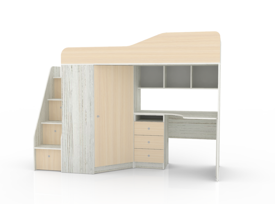 - Стеллаж для книг под спальным местом Основные параметры: - Кроватный модуль, размеры (Д*Г*В): 2332*832*1716 мм. - Спальное место: 800*1900 мм. - Угловой шкаф, размеры (Д*Г*В): 832*832*1350 мм. - Стол, размеры (Д*Г*В): 1100*740*735 мм. - Высота борта: 350 мм. - Рекомендованная высота матраса: 50-150 мм.