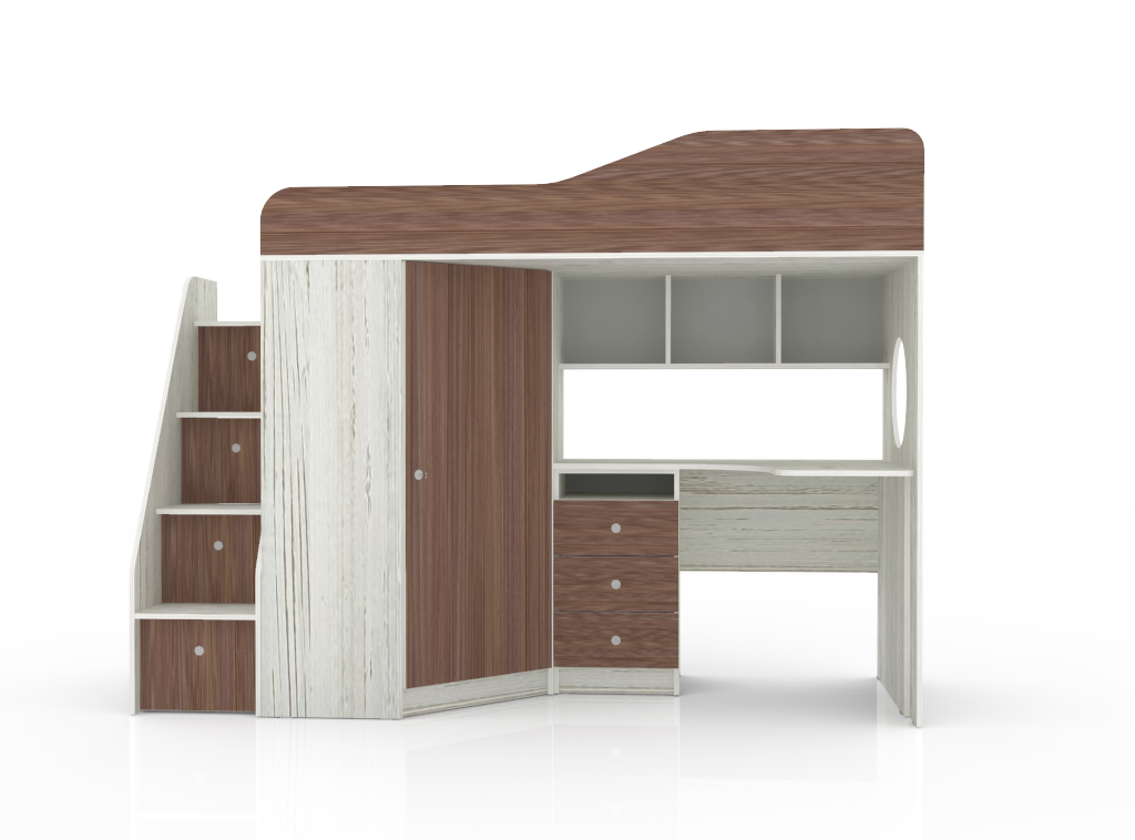 Кровать чердак Кадет 1 оснащен одним спальным местом, лестницей со ступенями в виде ящиков для хранения игрушек, письменным столом с тремя выдвижными ящиками под столешницей, полкой над столешницей и угловым шкафом для одежды. Данная модель подойдет как для детей младших классов, так и для детей более старшего возраста. Такая модель кровати поразит вас своей компактностью, вместительностью и практичностью.