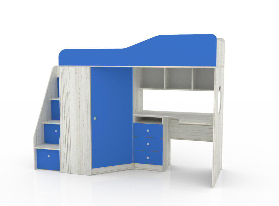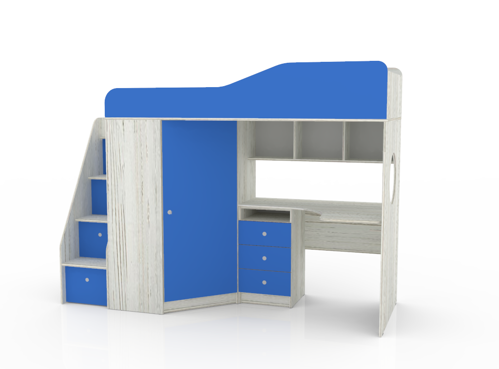 - Стеллаж для книг под спальным местом Основные параметры: - Кроватный модуль, размеры (Д*Г*В): 2332*832*1716 мм. - Спальное место: 800*1900 мм. - Угловой шкаф, размеры (Д*Г*В): 832*832*1350 мм. - Стол, размеры (Д*Г*В): 1100*740*735 мм. - Высота борта: 350 мм. - Рекомендованная высота матраса: 50-150 мм.
