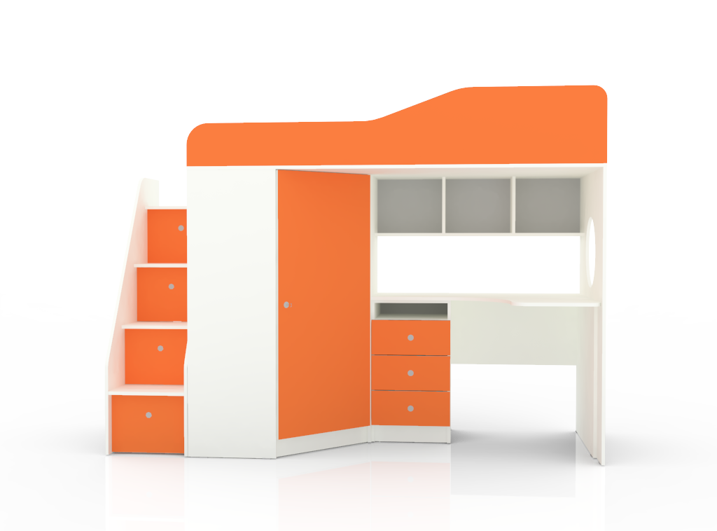 Кровать чердак Кадет 1 оснащен одним спальным местом, лестницей со ступенями в виде ящиков для хранения игрушек, письменным столом с тремя выдвижными ящиками под столешницей, полкой над столешницей и угловым шкафом для одежды. Данная модель подойдет как для детей младших классов, так и для детей более старшего возраста. Такая модель кровати поразит вас своей компактностью, вместительностью и практичностью.