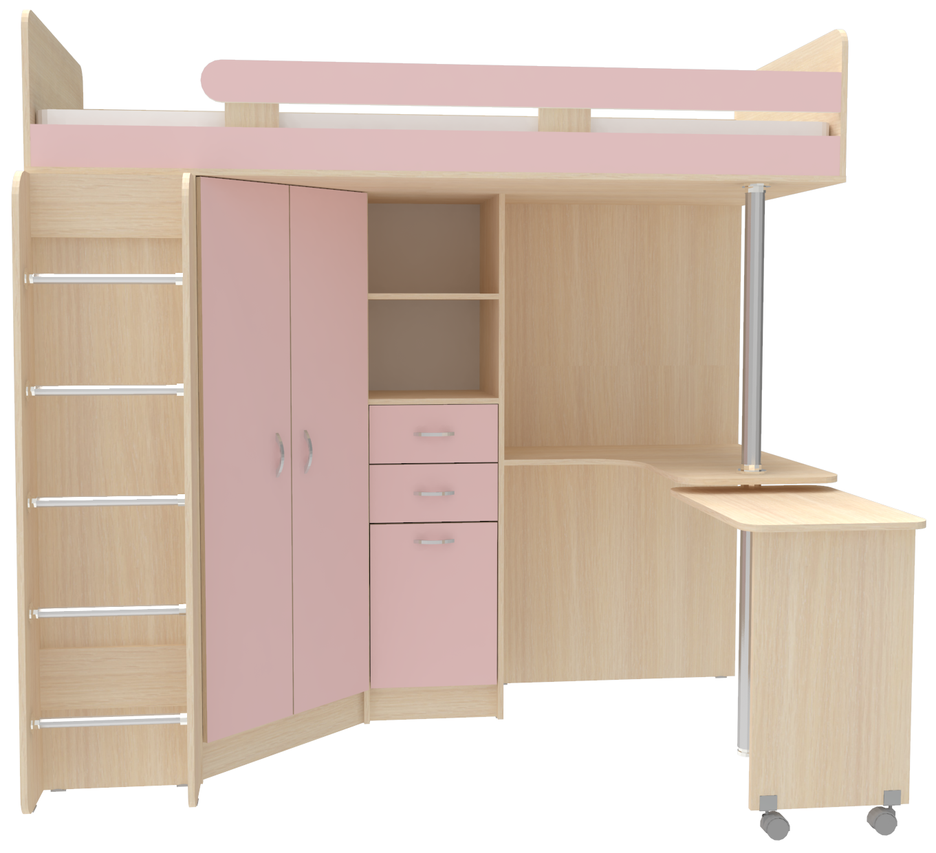 Кровать чердак Юниор 3 с металлической лестницей, Дуб Молочный (Розовый)