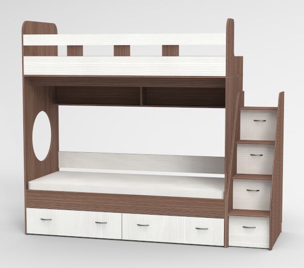 Трехъярусная кровать чердак Юниор решает проблему малого пространства сочетая в себе целый ряд функций: спальные места для троих, навесная полка для книг и игрушек, вместительный выдвижной ящик под кроватью может использоваться для хранения или как дополнительное спальное место, а так же приставная лестница расположенная сбоку, обеспечивающая быстрый и безопасный доступ на второй этаж, с безопасными ступенями в виде выдвижных ящиков. Дополнительный бортик для нижнего яруса покупается отдельно!!! Ступеньки лестницы представляют собой небольшие ящички, в которые можно сложить нижнее белье ребенка, игрушки и иные вещи. Уникальность Юниор заключается в: Цене Компактности Безопасности Надёжности Функциональности. Мебель изготовлена из ламинированного ДСП, с использованием кромки АБС, что позволяет продлить срок службы изделия и сохранить внешний вид. Отсутствие острых углов является самым главным критерием травмобезопастности детей. Кровать выполнена из надежной 16мм ламинированной ДСП. Все торцы мебели обрамлены кромкой ABS 1мм. Сборка универсальная, лестница может быть справа и слева. Спальное место 1900х800мм. Материал – ЛДСП. Мебель соответствует высоким стандартам качества и безопасности. Вся мебель сертифицирована и выполнена из экологически чистого материала. Двухъярусная кровать ЮНИОР являясь одновременно яркой, функциональной и универсальной мебелью, займет почтенное место в детской. *Предприятие-изготовитель оставляет за собой право вносить изменения в конструкцию изделия с целью улучшения технологических и экспутационных свойств мебели. Матрасы для кровати вы можете приобрести отдельно в разделе детских матрасов. Так же мы предлагаем ниже, в разделе Аксессуары, наиболее оптимальные варианты для данной кровати.