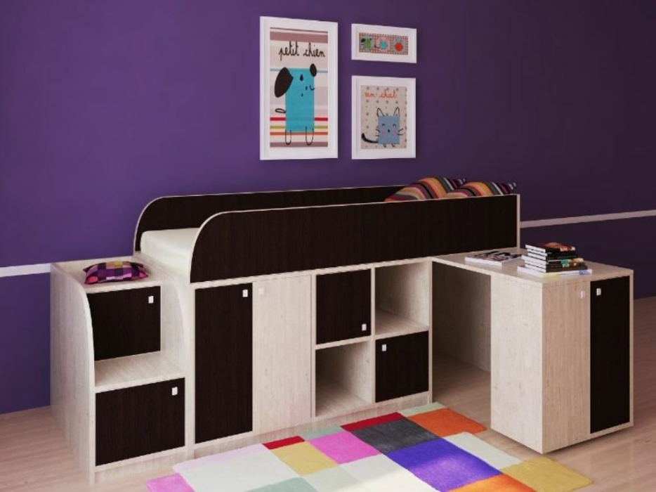 Кровать чердак Малыш 3 - замечательный вариант компактного размещения спального места, рабочей зоны и мест для хранения вещей. В кровати -чердаке Малыш 3 все эти составляющие объединены в общую группу. Выкатной стол, открытые и закрытые полки, шкаф для одежды и лестница - комод  разместят необходимые вещи ребенка. Спальное место с бортиками защитит от падения.  Мебель изготовлена из ламинированного ДСП, с использованием кромки АБС, что позволяет продлить срок службы изделию и сохранить внешний вид.  Кровать чердак Малыш 3 это: Компактность-– минимум площади в комнате Функциональность - 5 в 1 Экологичность – все материалы и фурнитура сертифицированы для производства детской мебели Безопасность – отсутствие острых углов с использованием кромки АБС 1мм исключает возможность травмирования детей в процессе эксплуатации Надежность – использование качественной импортной фурнитуры и длительный гарантийный срок 24 месяца Качество – изготовление на высокотехнологичном оборудовании европейского производства Экономичность – сокращение времени по подбору и поиску, а так же средств на необходимом наборе мебели для ребенка (приобретая по отдельности набор обойдется существенно дороже.) Размер спального места 80х180см. Кровать чердак Малыш производится в различных цветах. Корпус: Дуб молочный, белое дерево, бодего темный, венге. Фасады: Дуб молочный, белое дерево, бодего темный, венге, лайм, розовый, ирис, оранжевый, светло-синий голубой. На цветных фасадах: цвет кромки - бежевый. Эта компактная и многофункциональная детская кровать станет великолепным решением для небольшой детской комнаты. Фабрика проявляет заботу о здоровье детей, и поэтому использует в производстве только экологически чистые материалы. Экологичная мебель не вызывает аллергии и не вредит здоровью. Кроме того, мебель от этого производителя спроектирована с учетом, что ей будут пользоваться дети, поэтому при ее создании были приняты все меры для уменьшения ее травмоопасности. У мебели для малышей нет острых углов, о которые ребенок может больно удариться. Кровати-чердаки обязательно оборудованы ограничителями, которые не дадут ребенку случайно упасть с кровати. разумеется, особое внимание компания уделяет прочности и надежности производимой мебели.Являясь малогабаритной, компактной и многофункциональной кроваткой Малыш 3 станет великолепным решением для небольшой детской комнаты. Матрас для кровати вы можете приобрести отдельно в разделе детских матрасов. Так же мы предлагаем ниже, в разделе Аксессуары, наиболее оптимальные варианты для данной кровати.