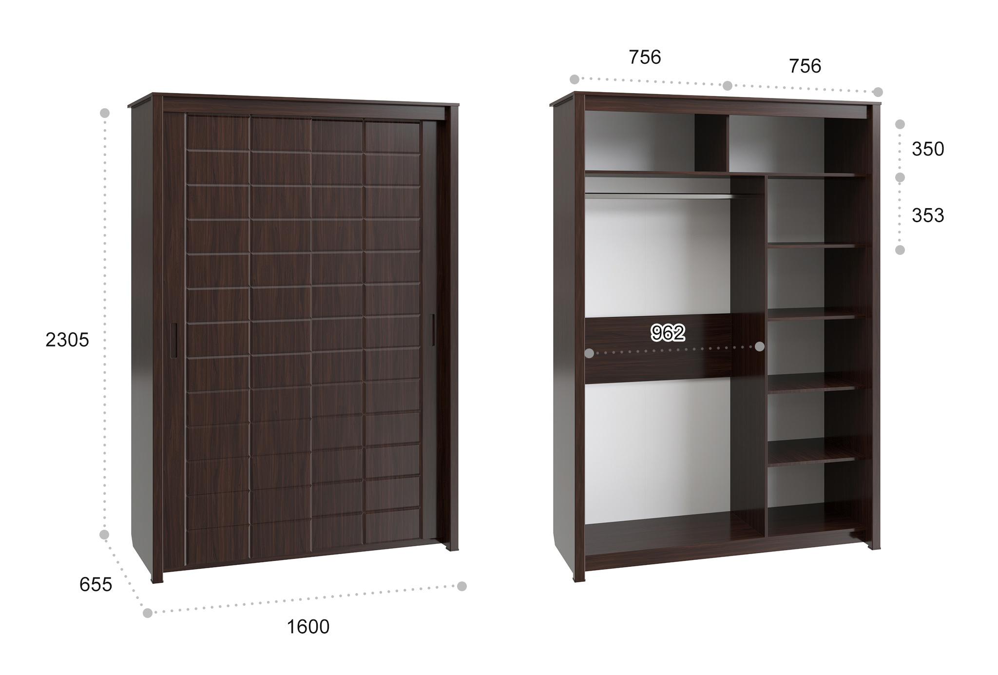 Размеры модуля (ш/в/г) вмм: 1600х2305х655.Материал корпуса/фасада: ЛДСП, МДФ.