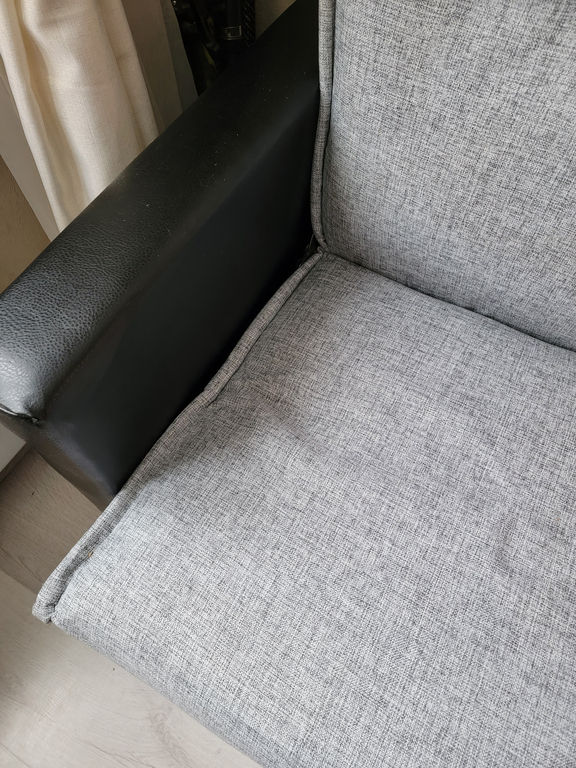 Ну и на новом подлокотнике содрана экокожа. И вмятина на сидении. Если есть возможность, то лучше посмотреть другой диван.