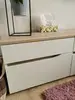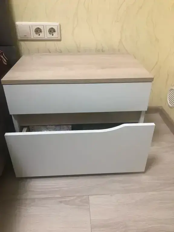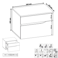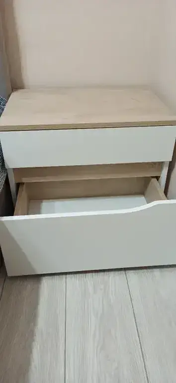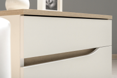 Тумбочка оборудована двумя удобными выдвижными ящикам на шариковых направляющих полного выдвижения. Лицевую фурнитуру заменяет стильный вырез, за которым видно древесный декор корпуса. Вырезы делают внешний вид изделий асимметричным, что делает композицию современной и динамичной. Установлена тумба прикроватная Муссон 16.03 на пластиковые опоры защищая поверхность пола от механических повреждений. Не универсальная сборка - собирается только так, как представлено на изображениях.