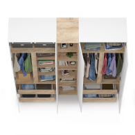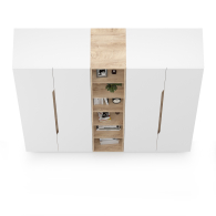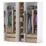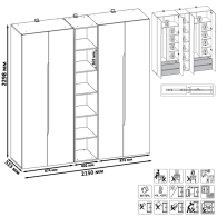 В этот комплект входят два шкафа Муссон 13.198 и открытый стеллаж Муссон 13.349. За распашными дверками шкафа оборудованы три отделения - нижнее с ящиками, верхнее с антресольной полкой и центральное со штангой для одежды на вешалках и полками. Два вместительных внутренних ящика на шариковых направляющих послужат отличным комодиком для деликатных вещей и белья. Центральное отделение со штангой для одежды на вешалках и полками может быть собрано на любую сторону. На обратной стороне двери размещается зеркало. Стеллаж оборудован пятью поками для хранения вещей и элементов декора. Мебель выполнена из прочной ламинированной ДСП 16 мм, торцы деталей закромлены плёнкой ПВХ 0,4-2 мм. Поставляется в разобранном виде, надёжно упакованной в гофрокартон, с приложенной подробной инструкцией по сборке. Открытый стеллаж и два шкафа для одежды Муссон - элементы из набора мебели для спальни Муссон.