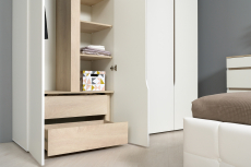 Открытый стеллаж и два шкафа для одежды Муссон - компактная и вместительная система хранения для небольшой спальни.